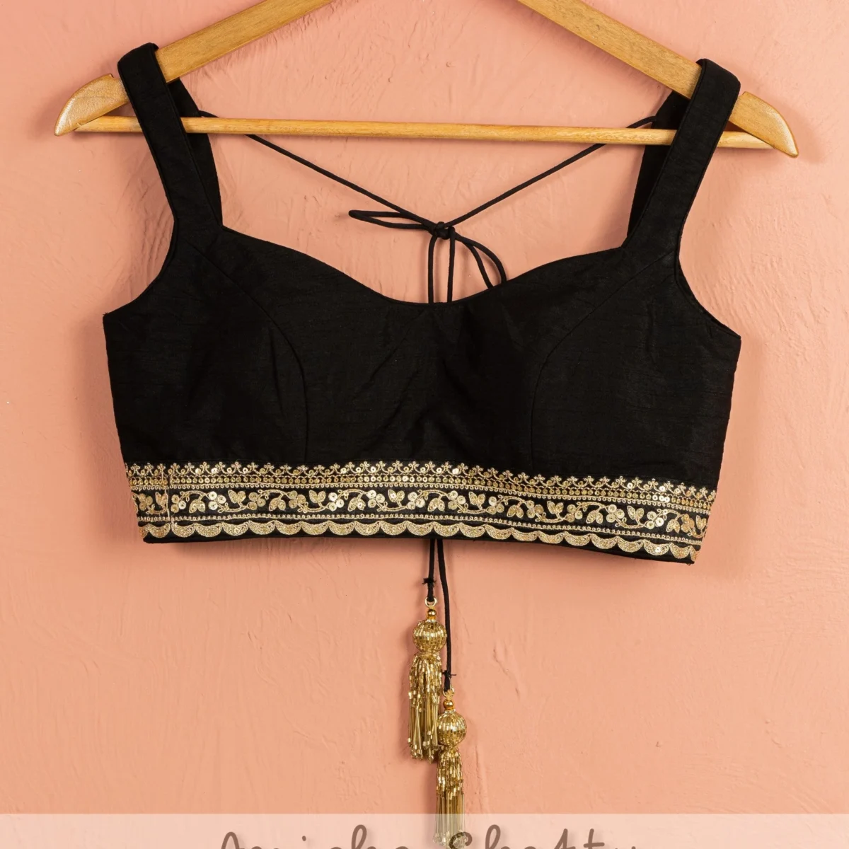 - Introducing our exquisite Black Stonework Silk Lehenga paired with a Black Zari Blouse . Crafted from raw silk, the lehenga showcases intricate stonework that exudes luxury. The raw silk blouse with Zari border complements the ensemble beautifully. The net dupatta adorned with a matching Zari border adds a touch of finesse. Perfect for formal events, evening celebrations, weddings. Composition: Lehenga…