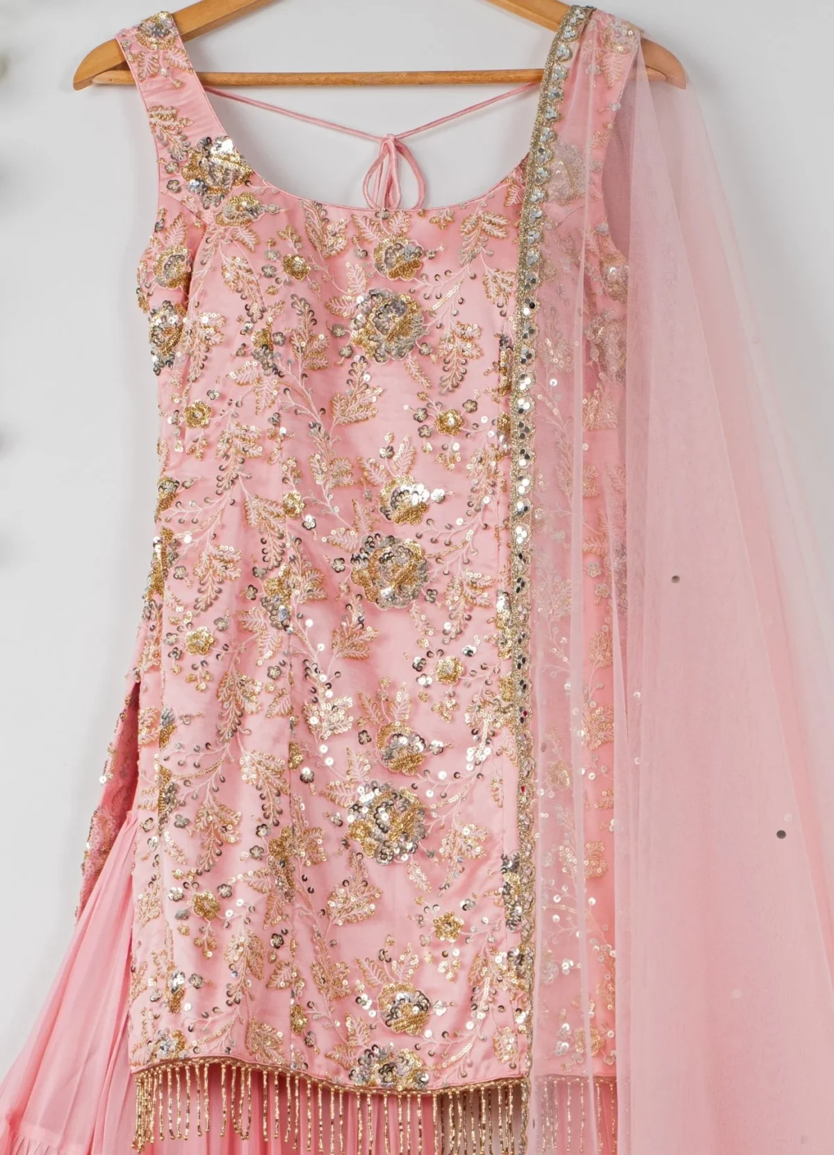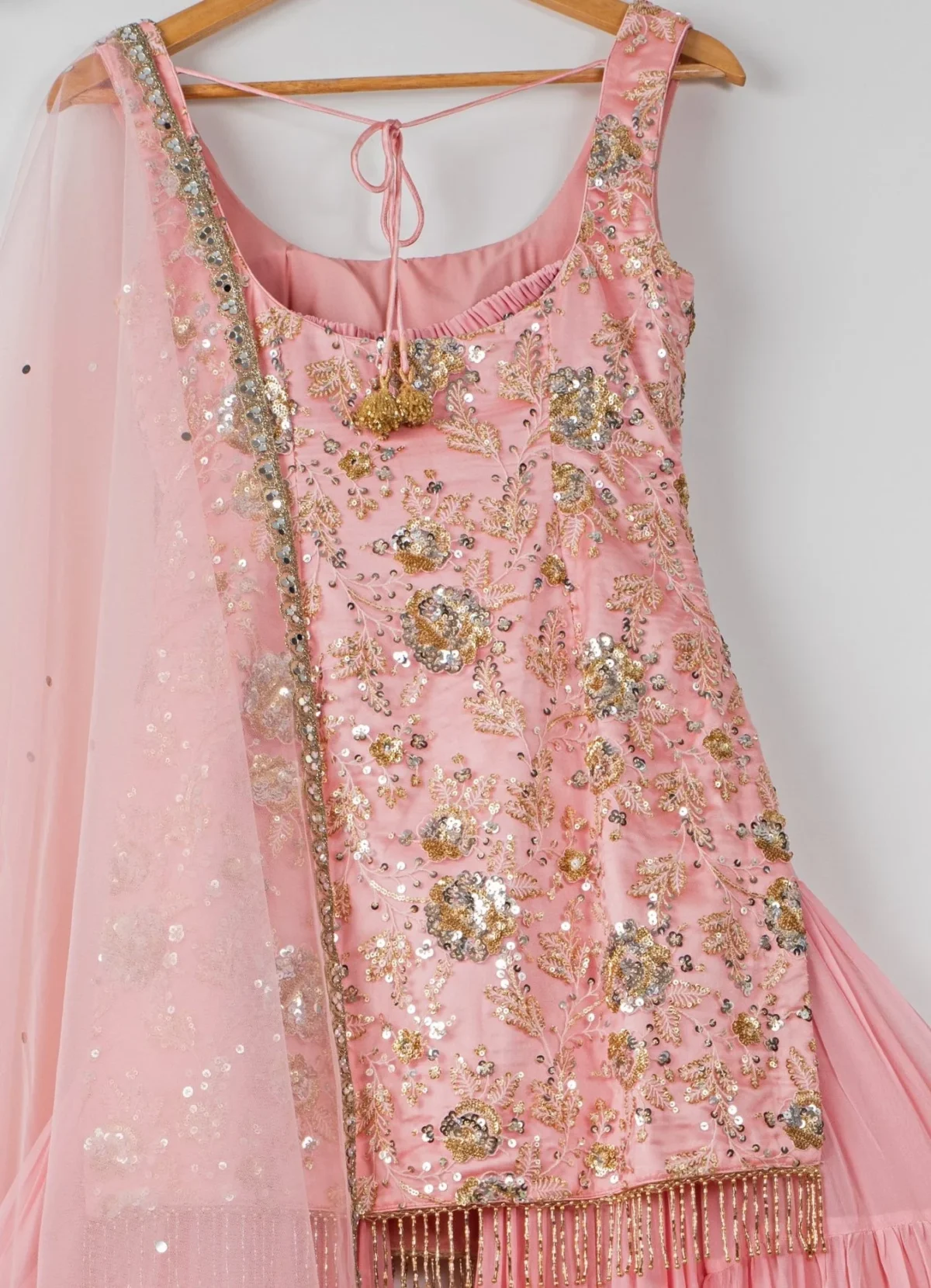 - Sharara: Georgette, Kurta: Georgette, Dupatta: Georgette, Dupatta Emb: Sequin Work & Zari Work, Kurta & Sharara Emb: Sequin Work & Zari Work