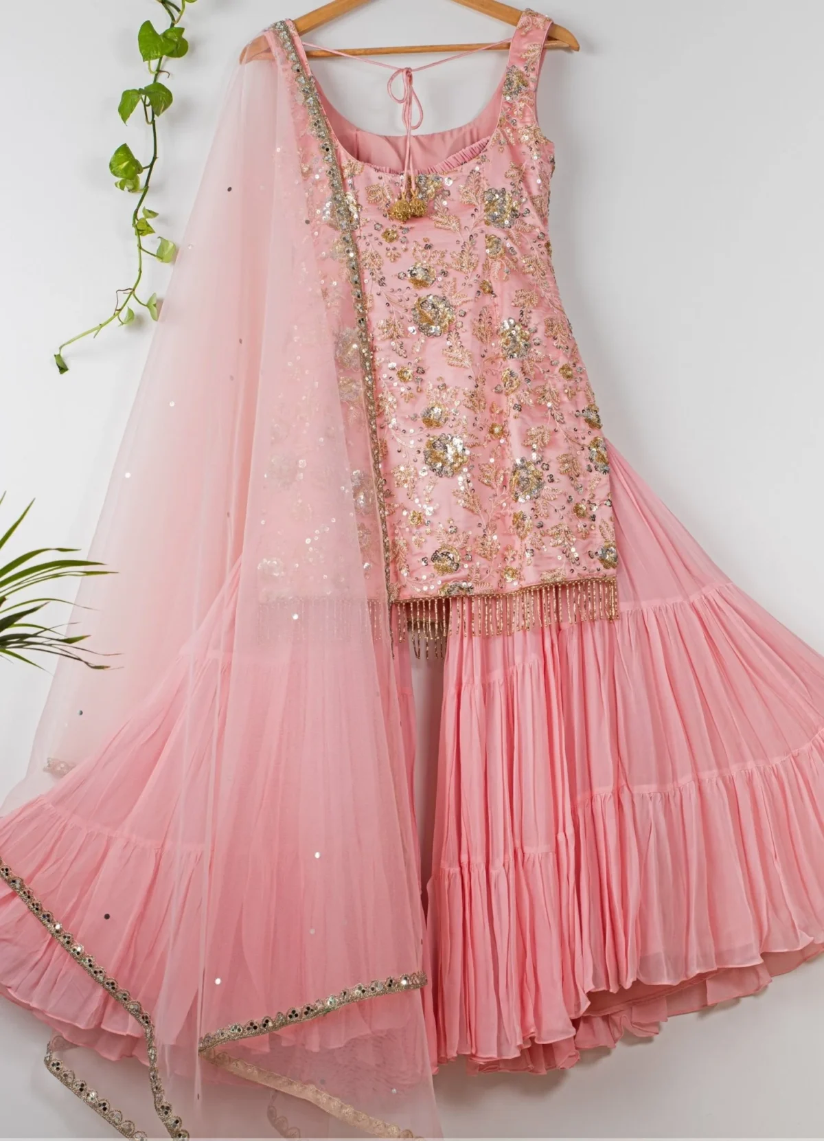 - Step into elegance with our Cherry Blossom Sequinned Kurta Sharara Set perfect for a haldi outfit. The Georgette Sharara flows gracefully. The Kurta features Floral Embroidered Sequins and Thread work on a Net Base, illuminating your look. The Net Dupatta features Abla and Mirror Work Border for an added layer of charm. Composition: Sharara : Georgette, Kurta : Floral Embroidered Sequins…
