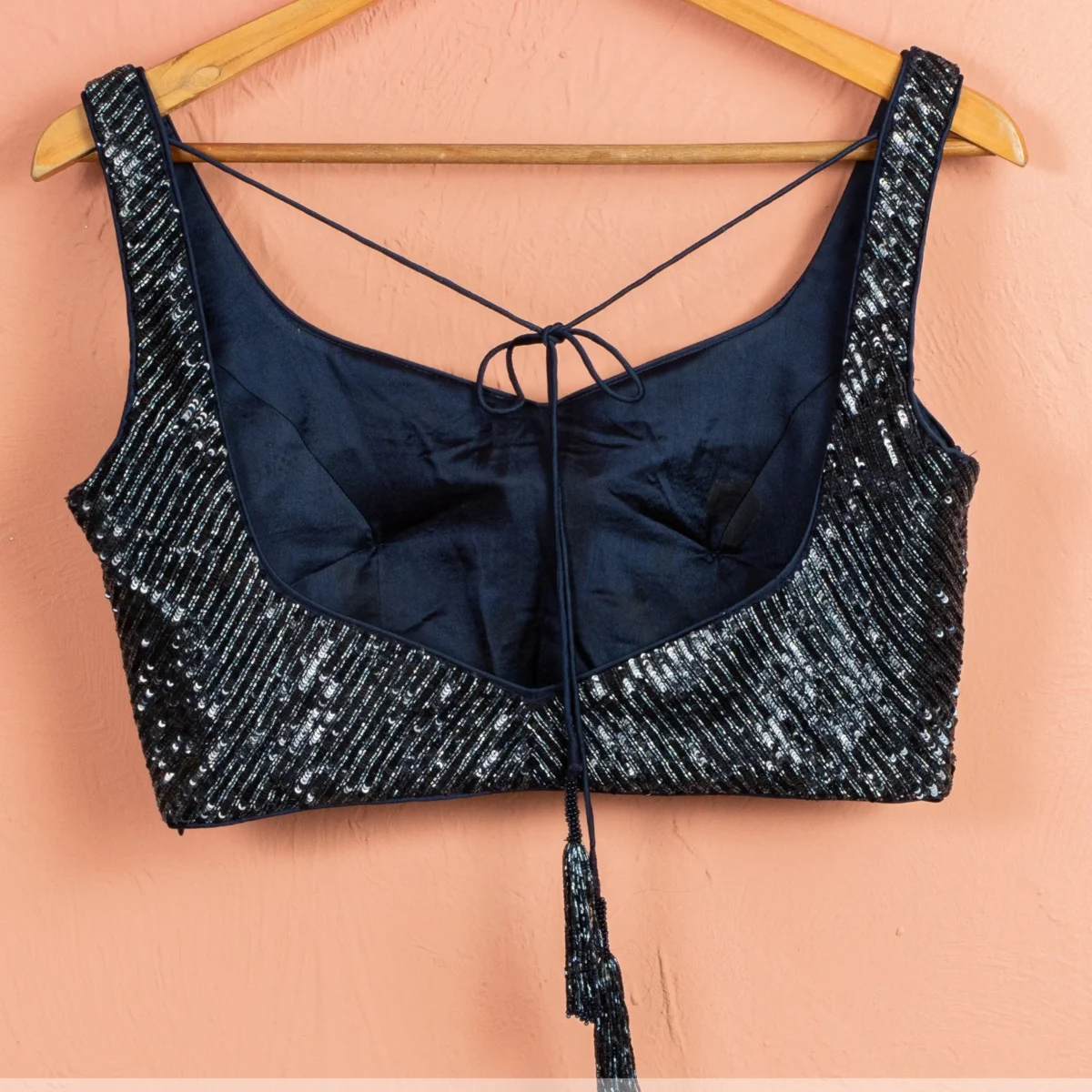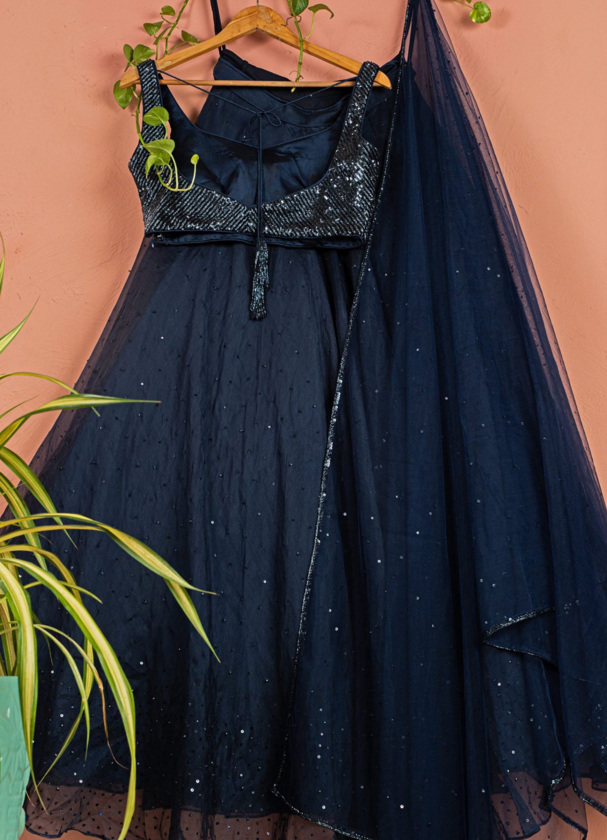 - Introducing our Midnight Blue Shimmer Organza Lehenga Set, a blend of elegance and glamour. Crafted from organza, the lehenga features intricate sequence work that adds a mesmerizing sparkle to the ensemble. The net blouse and dupatta, both adorned with sequence work, complete the look with finesse. Perfect for evening events, formal gatherings, and celebratory occasions. Composition: Lehenga: Organza with Sequence Work,…