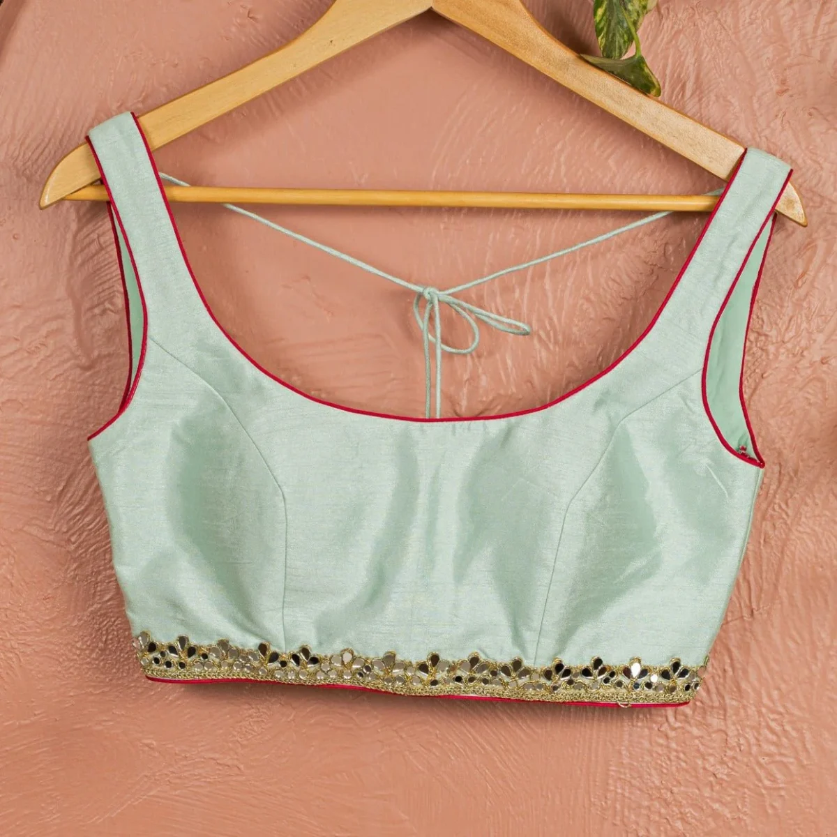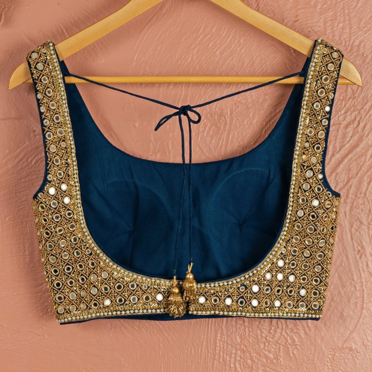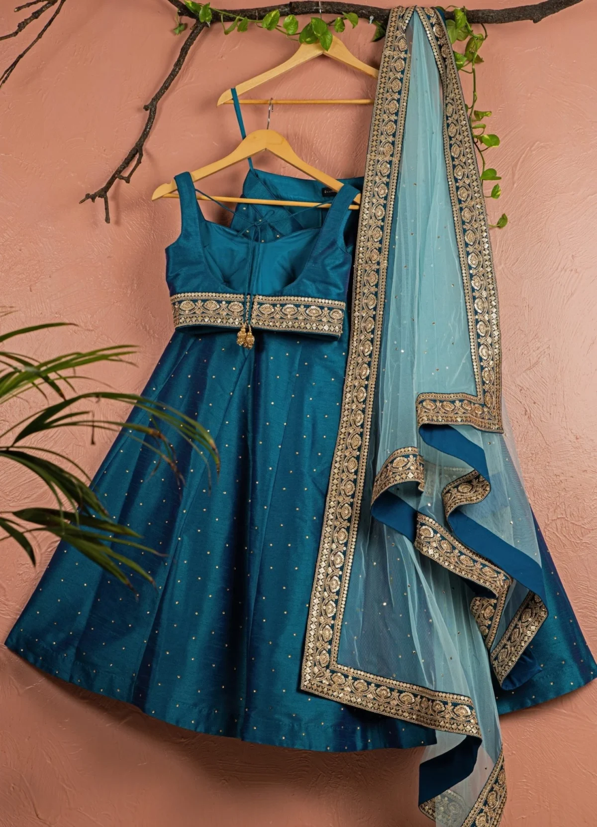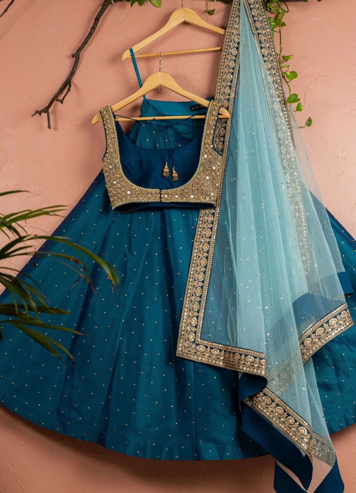 - Wrap yourself in our Teal Blue Stonework Silk Lehenga With Gold and Teal Mirror Blouse and Sky Blue Dupatta for a Wedding event. The Raw Silk Lehenga features intricate Stonework, evoking a dreamy charm. The Raw Silk Gold and Teal Mirror Blouse adds a touch of elegance. The Sky Blue Net Dupatta, adorned with a Zari Border, completes the look.…