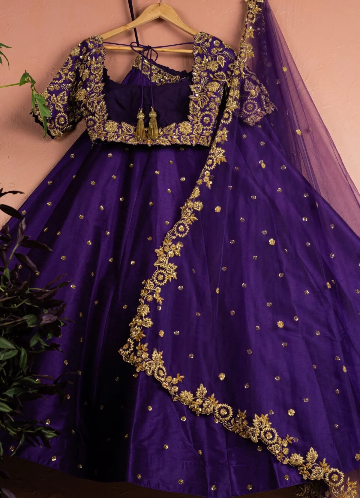 - Featuring the Enchanted Violet & Gold Lehenga Set – a spellbinding fusion of luxury and charm ! Crafted from raw silk, the lehenga showcases intricate zardosi and sequin embroidery. The raw silk blouse is enriched with zardosi and sequin work, while the net dupatta gleams with sequins and zardosi embroidery. Composition: Lehenga & Blouse: Raw Silk, Dupatta: Soft Net All…