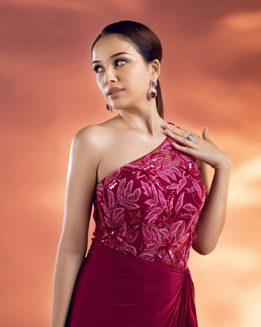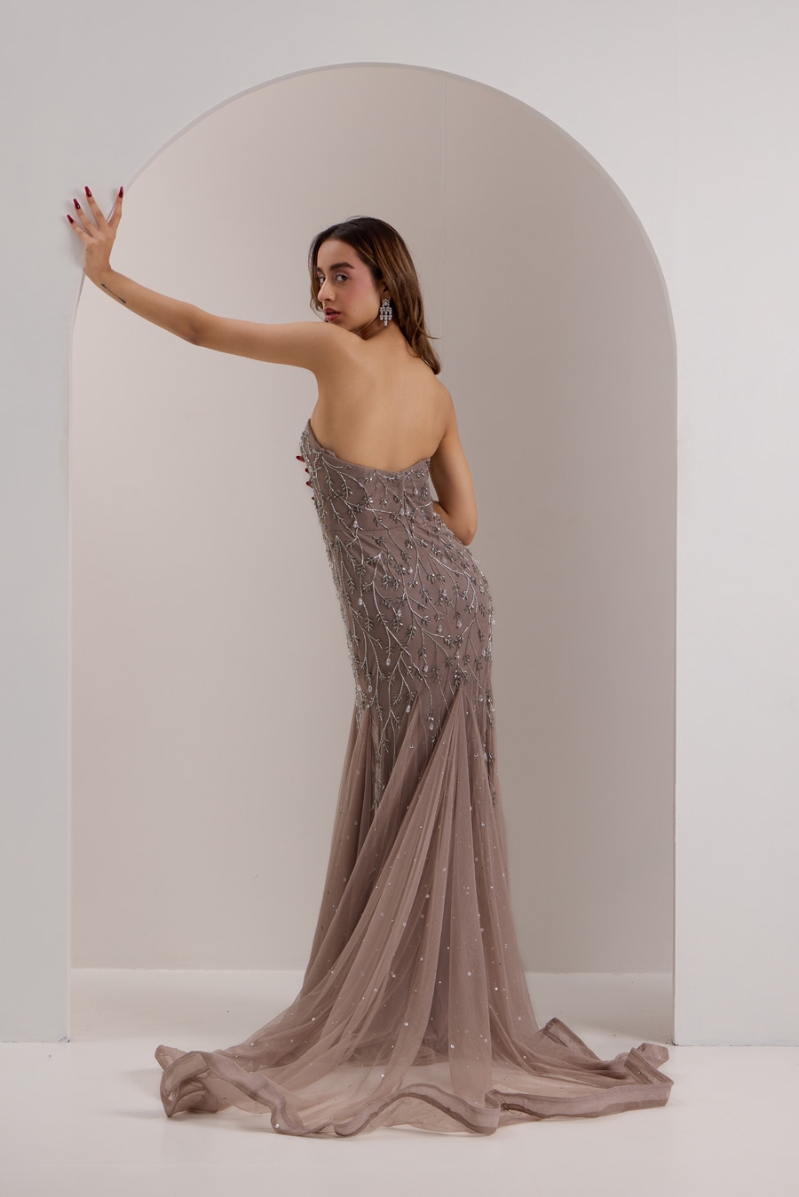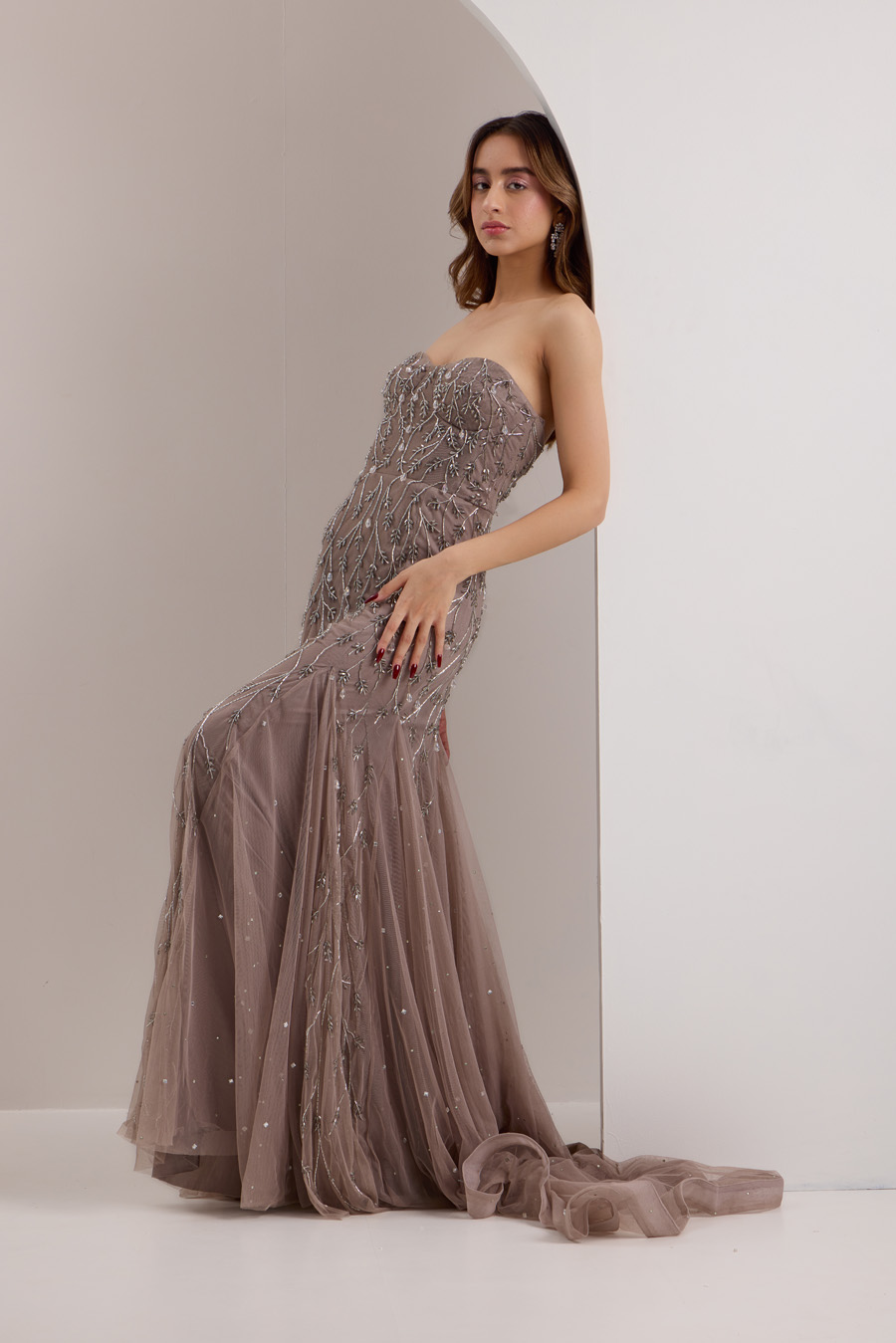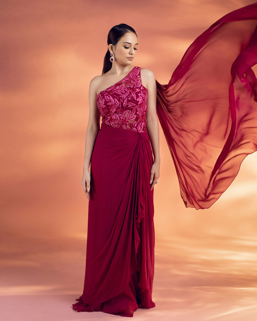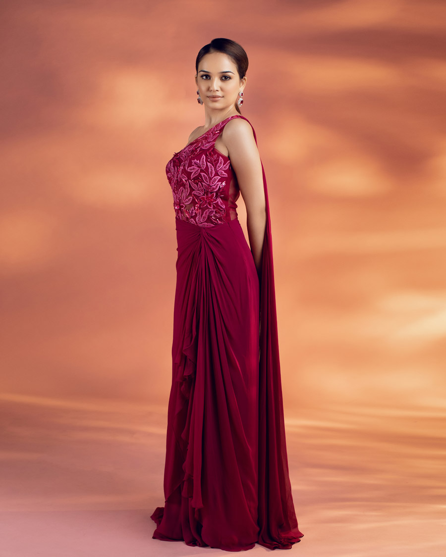 - CORSET SAREE GOWN WITH SHOULDER DRAPE