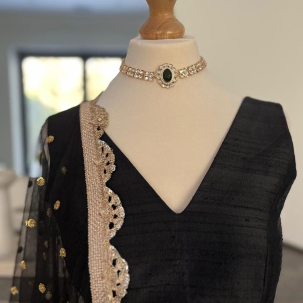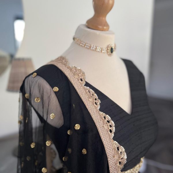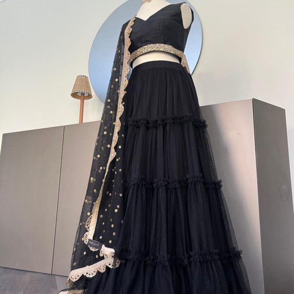 - Black tiered tulle with ruffle detailing lehenga teamed with a black raw silk blouse with a modest neckline depth. A net dupatta with a gold scalloped border completes the look. Size 36 Waist 30-31 Length 42 Neck Depth 9