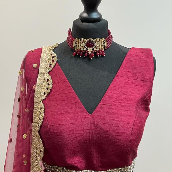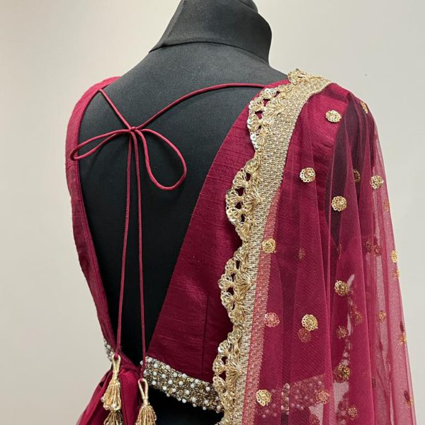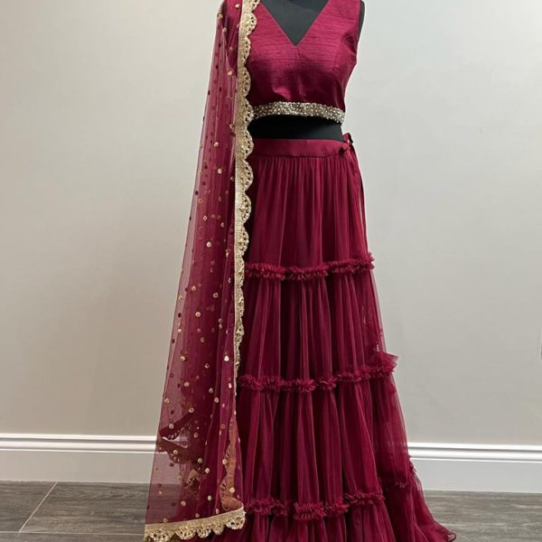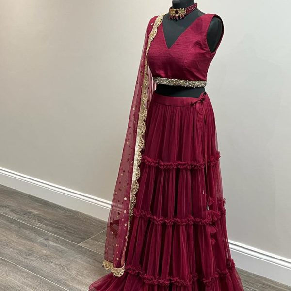 - Our bespoke burgundy tiered tulle with ruffle detailing lehenga teamed with a burgundy raw silk blouse with a modest neckline depth. A net dupatta with scalloped gold border completes the look. Size 38 Waist 31/32 Length 43
