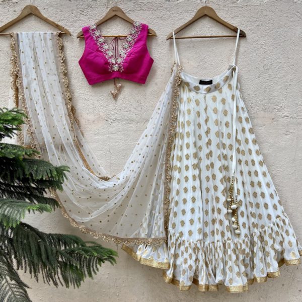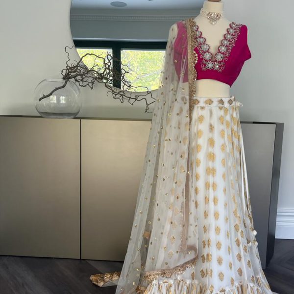 - Ivory butti georgette lehenga with big ruffle and gota border detailing paired with fuchsia raw silk blouse. Accompanied by an ivory sequin scattered dupatta. Size 36 Waist 31-32 Length 43