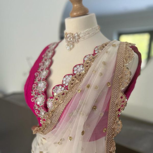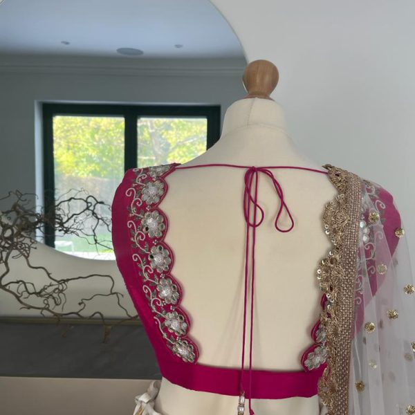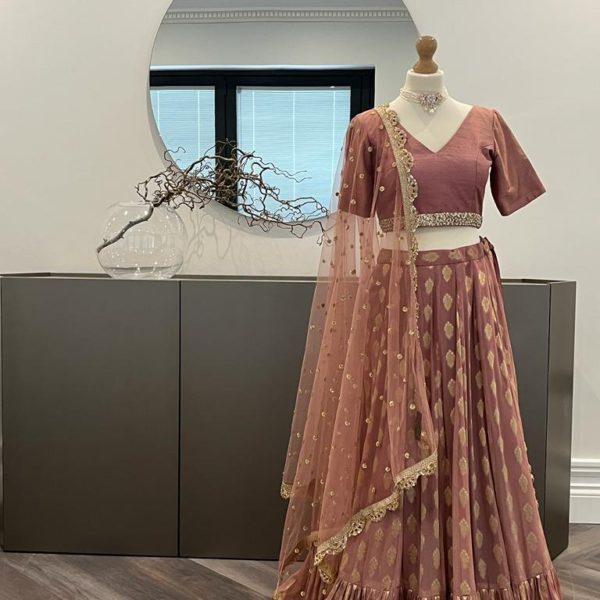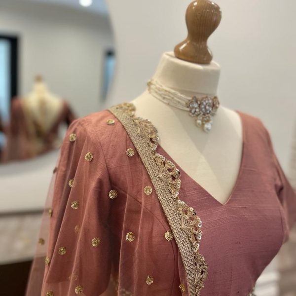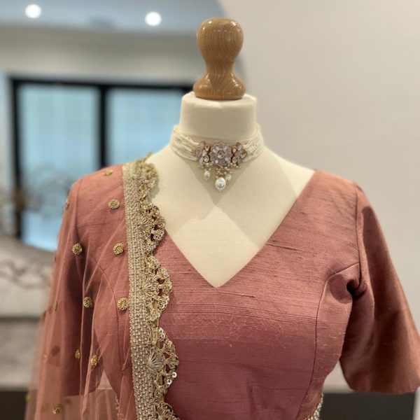 - Our bespoke mulberry pink georgette butti motif lehenga teamed with a matching raw silk blouse with sequin/pearl zari work. A net dupatta with a scalloped edge gold border completes the look. Size 36 Waist 30-31 Length 42-43 Neck Depth 9