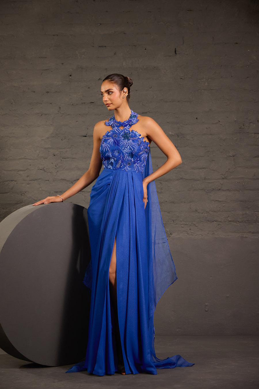 - Featuring a metallic blue halterneck cutwork drape gown in shimmering georgette, handcrafted with sequins,crystals, katdana, and beadwork, paired with a pure organza attached drape. Perfect for evening galas—style it with subtle makeup, a chic hairstyle, statement jewellery, and heels for a glamorous finish.