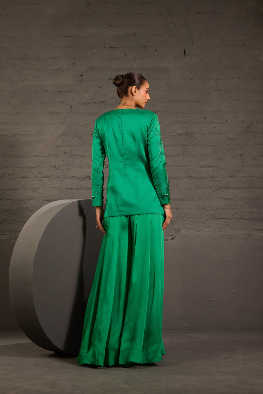 - Featuring emerald green full sleeves tunic adorned with sequins, beads,katdana, resham and pipe work in satin twill, paired with a kalidar organza sharara and matching dupatta. Perfect for festive evenings—style with statement earrings, a chic hairstyle, and heels for a refined look.SHOULDER PADDED