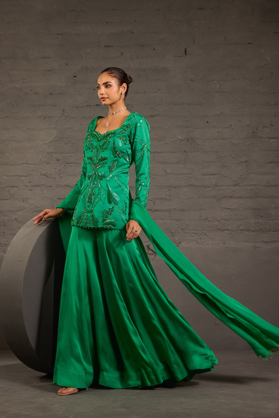 Hand Embroidred Emerald Green Short Tunic With Sharara & Dupatta Set