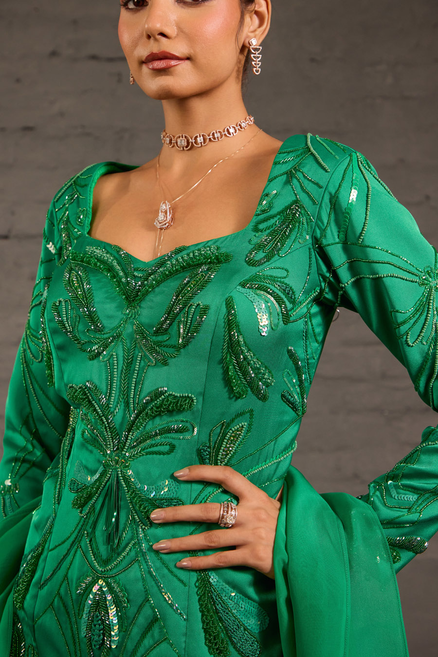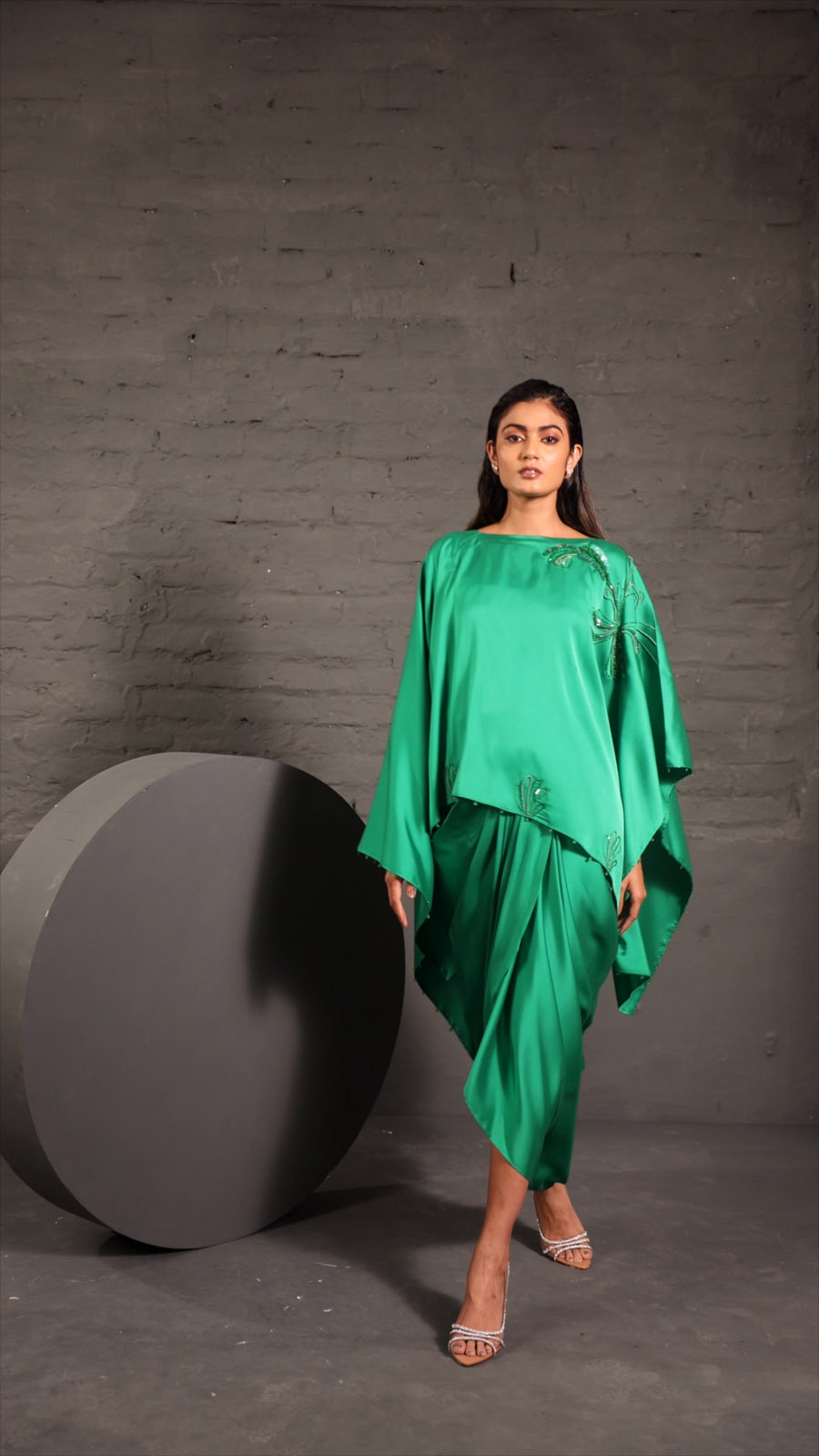 - Featuring an emerald green flowy kaftan adorned with sequins, beads,pipe , and resham work, paired with a satin twill asymmetric drape skirt. Blending modern charm with festive elegance, this ensemble is perfect for evening celebrations. Style with statement jewellery and heels for an elegant finish.