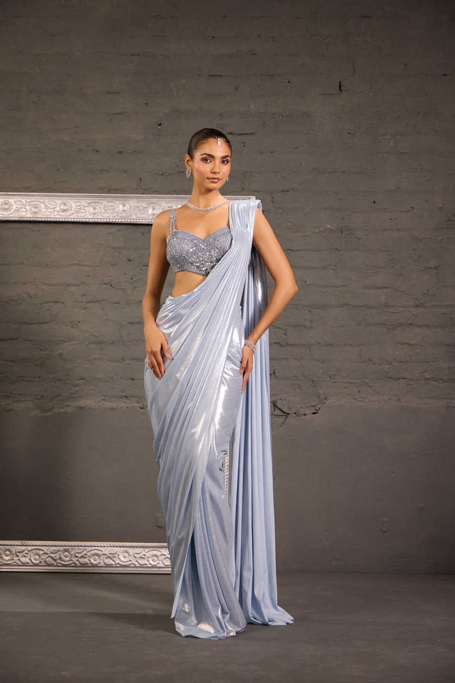 Hand Embroidered Grey Blouse With Metallic Drape Saree