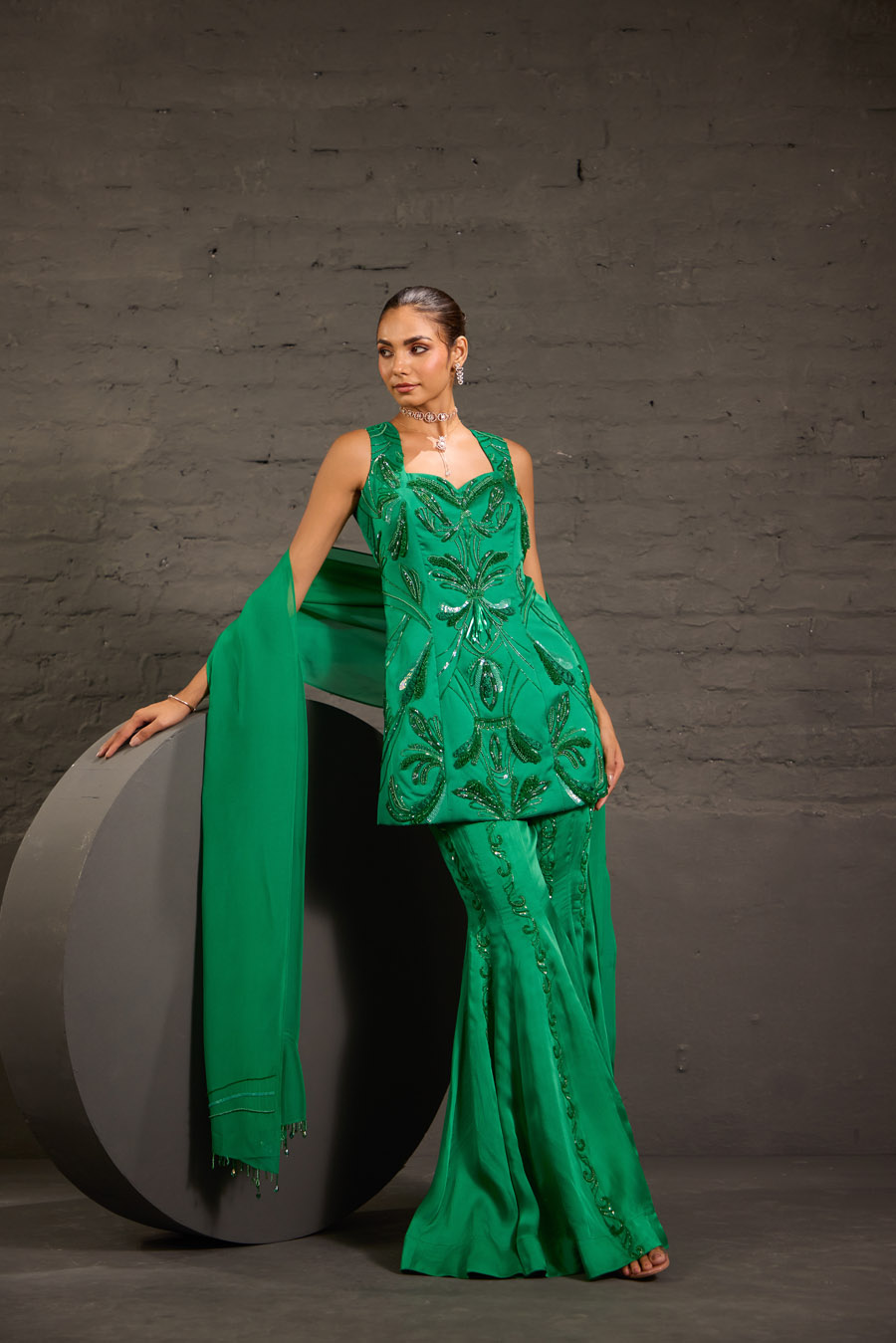 - Featuring emerald green hand embroidred sleeveless tunic adorned with sequins, beads,resham,katdana and pipe work in satin twill, paired with satin organza sharara and dupatta. Perfect for festive evenings—style with statement earrings, a chic hairstyle, and heels for a refined look.
