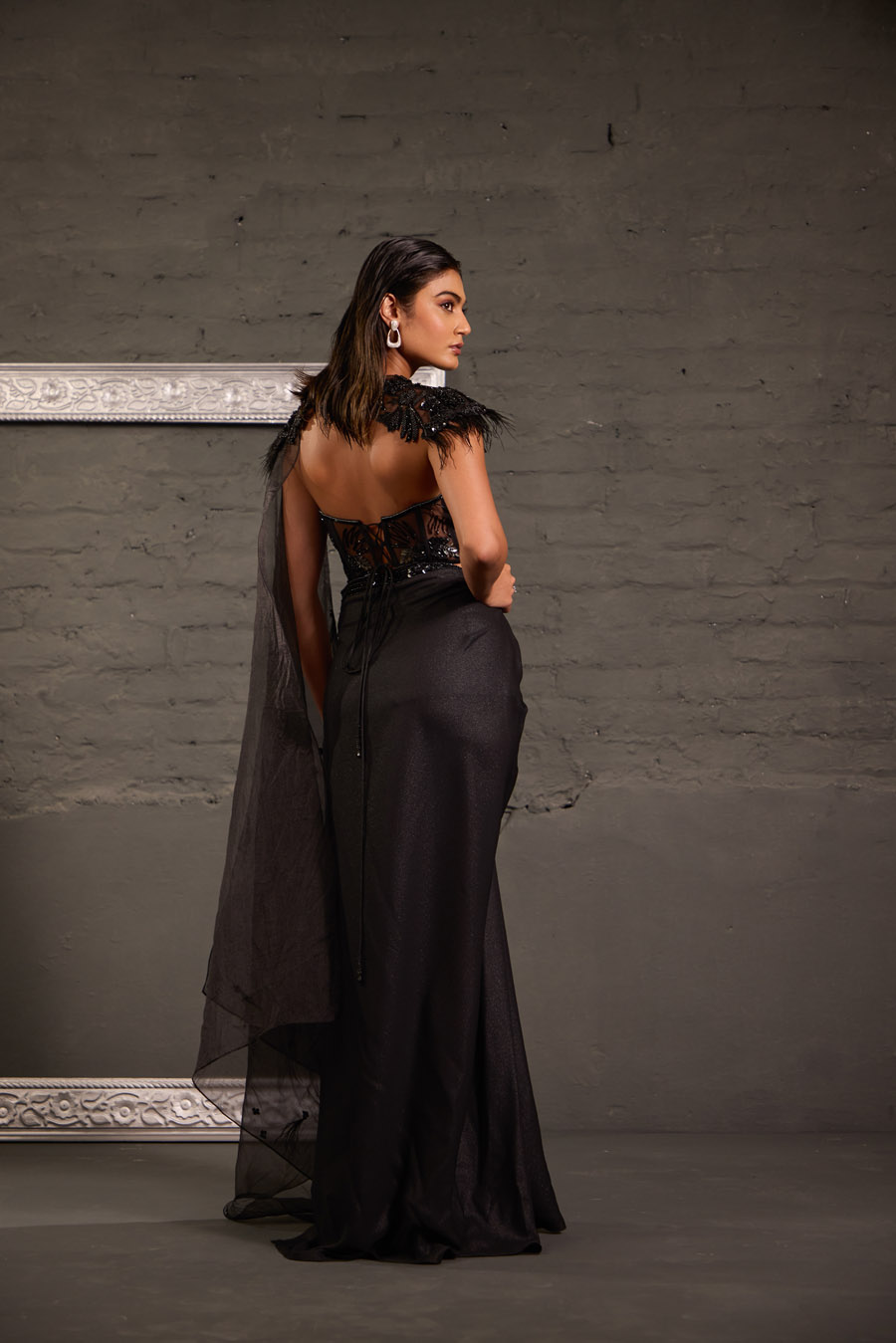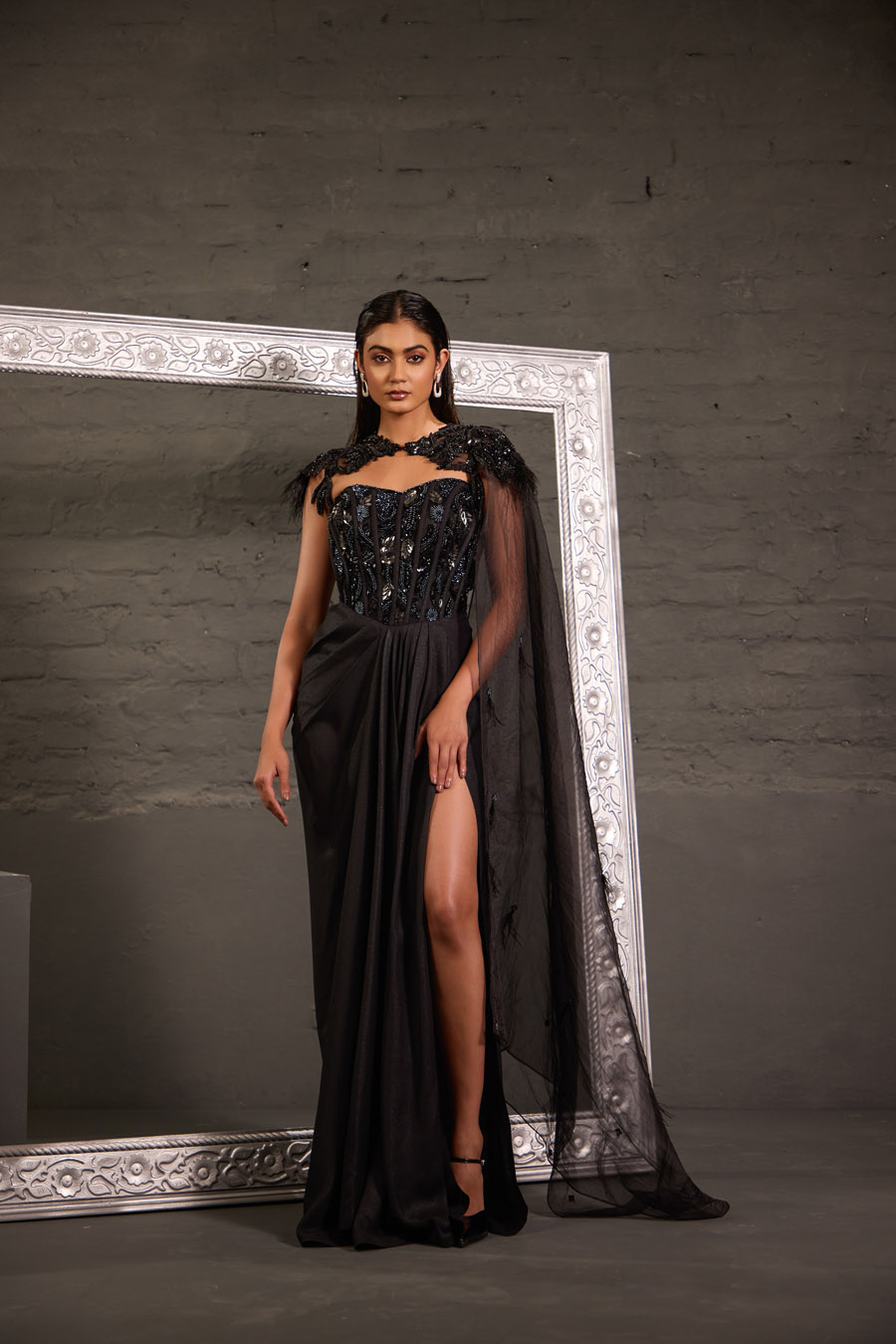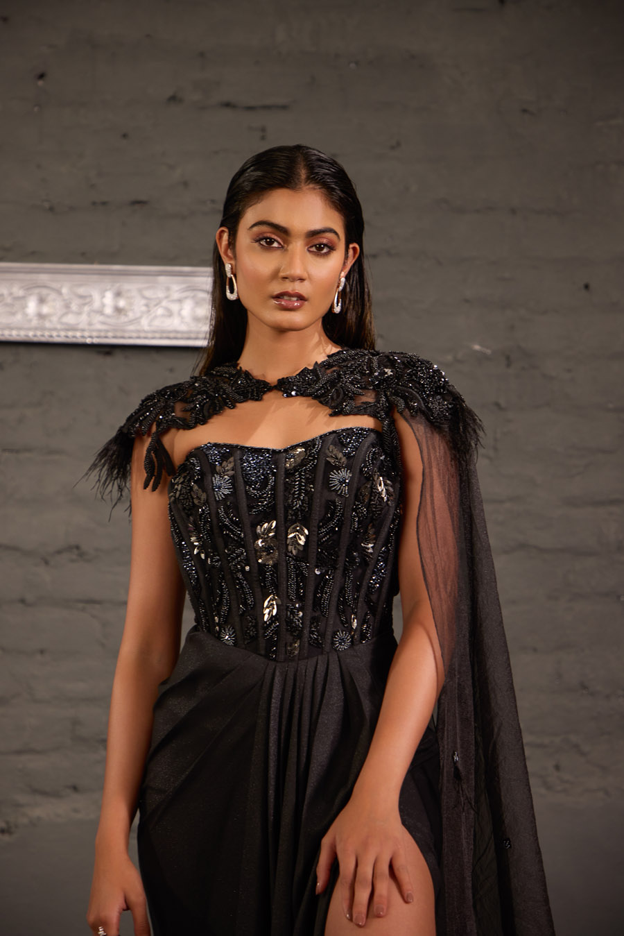- Featuring a corset style gown embellished with katdana, sequence and beads.It comes with a detachable cut work shoulder cape with organza palla attached on one side.