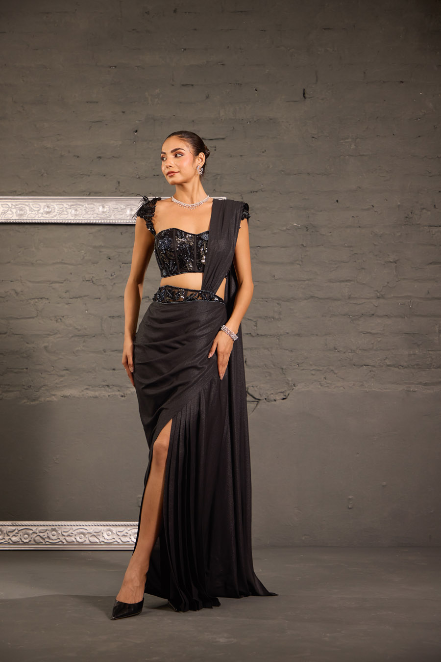 - Featuring a black net blouse adorned with hand-embroidered sequins, beads, and pipe work, paired with a metallic georgette drape saree. Perfect for modern celebrations or cocktail evenings—style with subtle makeup, open hair, statement jewellery, a clutch, and sleek high heels for an elegant finish.