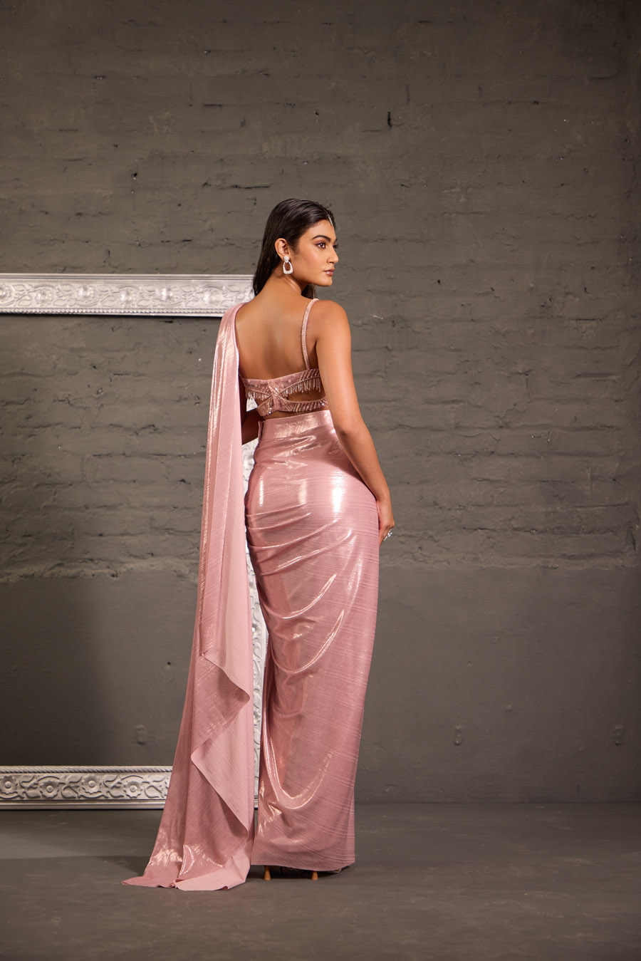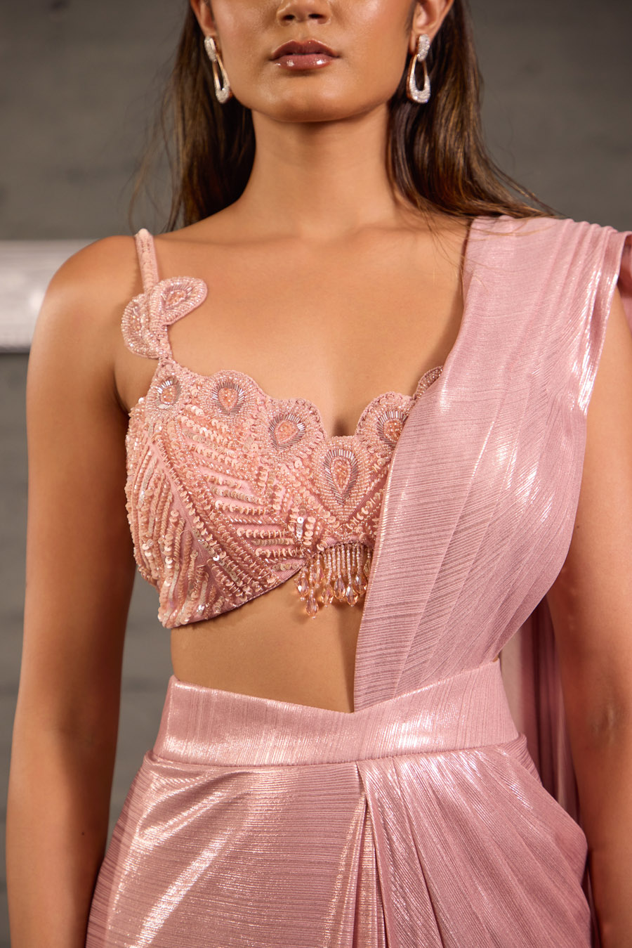 - Featuring a soft pink cutwork blouse in net, adorned with sequins, beads,crystals,katdana, and pipe, paired with a metallic lycra drape saree. Perfect for sangeet, cocktail, or welcome lunch—style with statement jewellery, clutch & pair of high heels for an elegant finish.