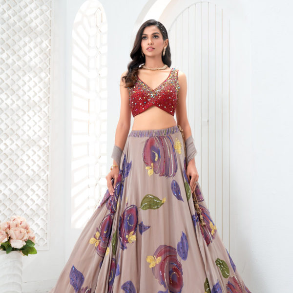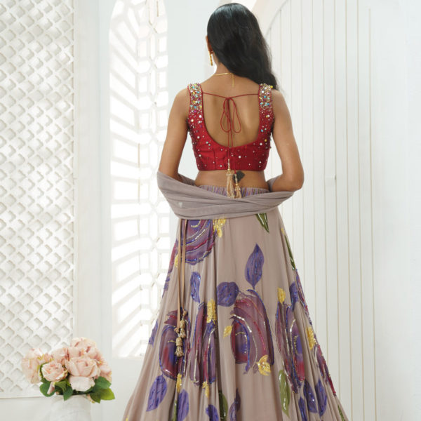 - Mauve georgette hand painted and hand embroidered lehenga with Burgundy floral embroidered corset and dupatta set.