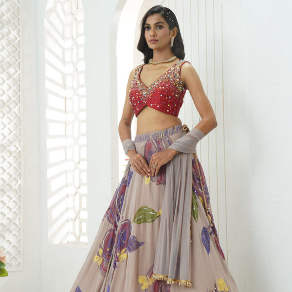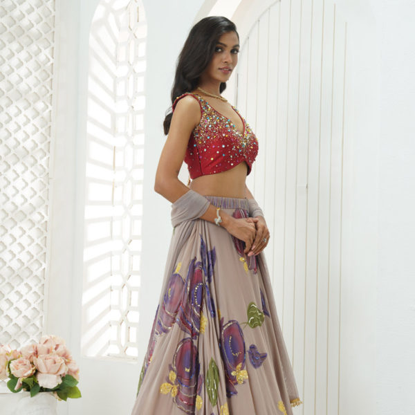 - Mauve georgette hand painted and hand embroidered lehenga with Red Pearl and stone embroidered blouse and dupatta set.