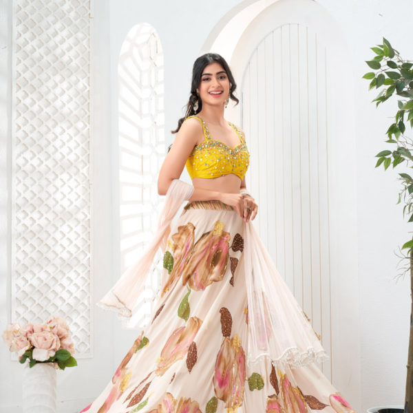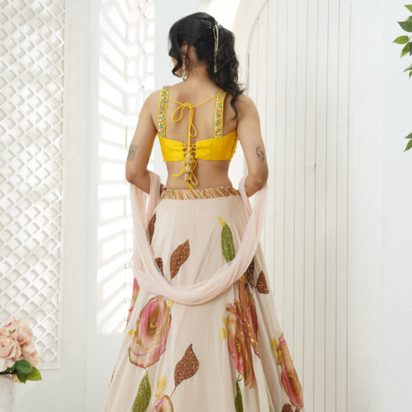 - Ivory georgette hand painted and hand embroidered lehenga with Mint Green floral embroidered bralette and Ivory hand embroidered dupatta set.