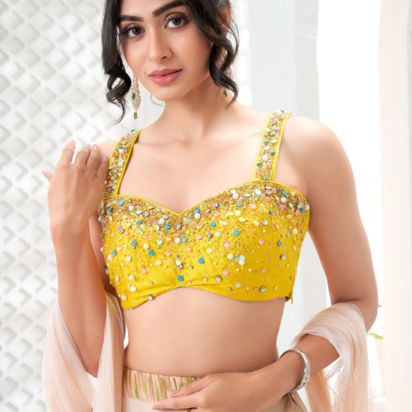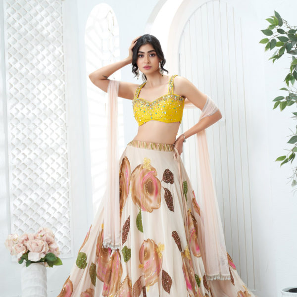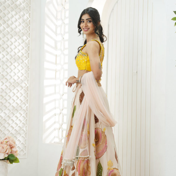 - Baby pink georgette hand painted and hand embroidered lehenga with Yellow Pearl and Stone embroidered bustier and Baby pink dupatta set.