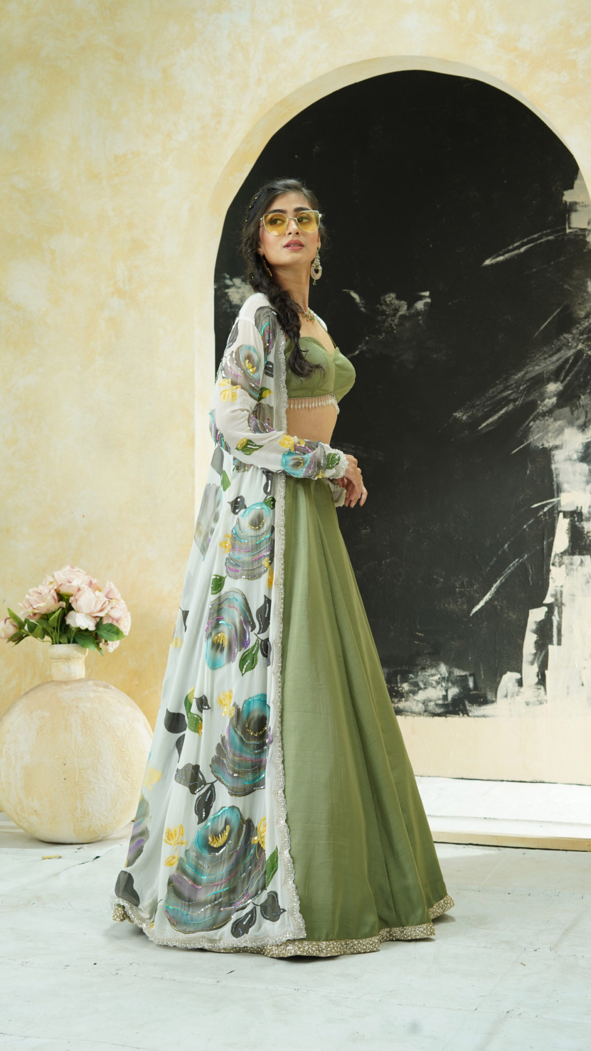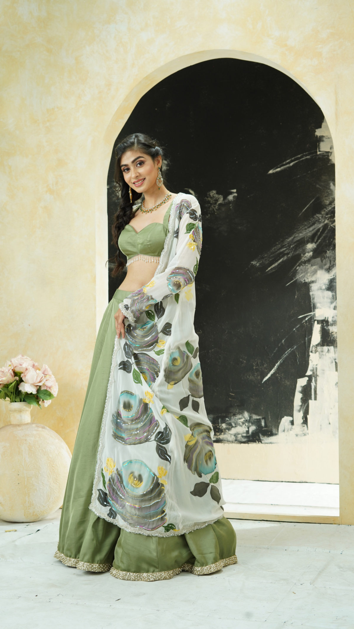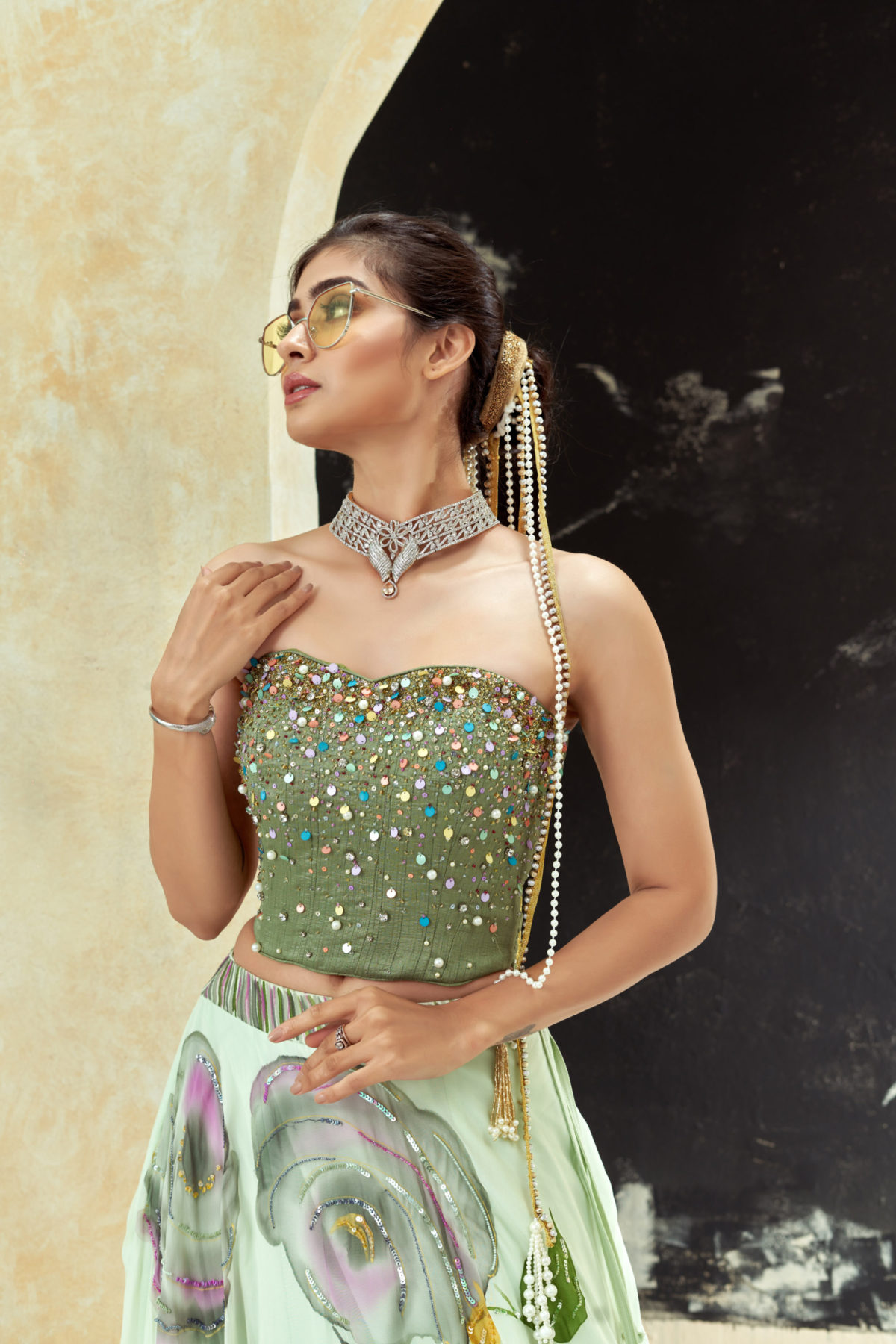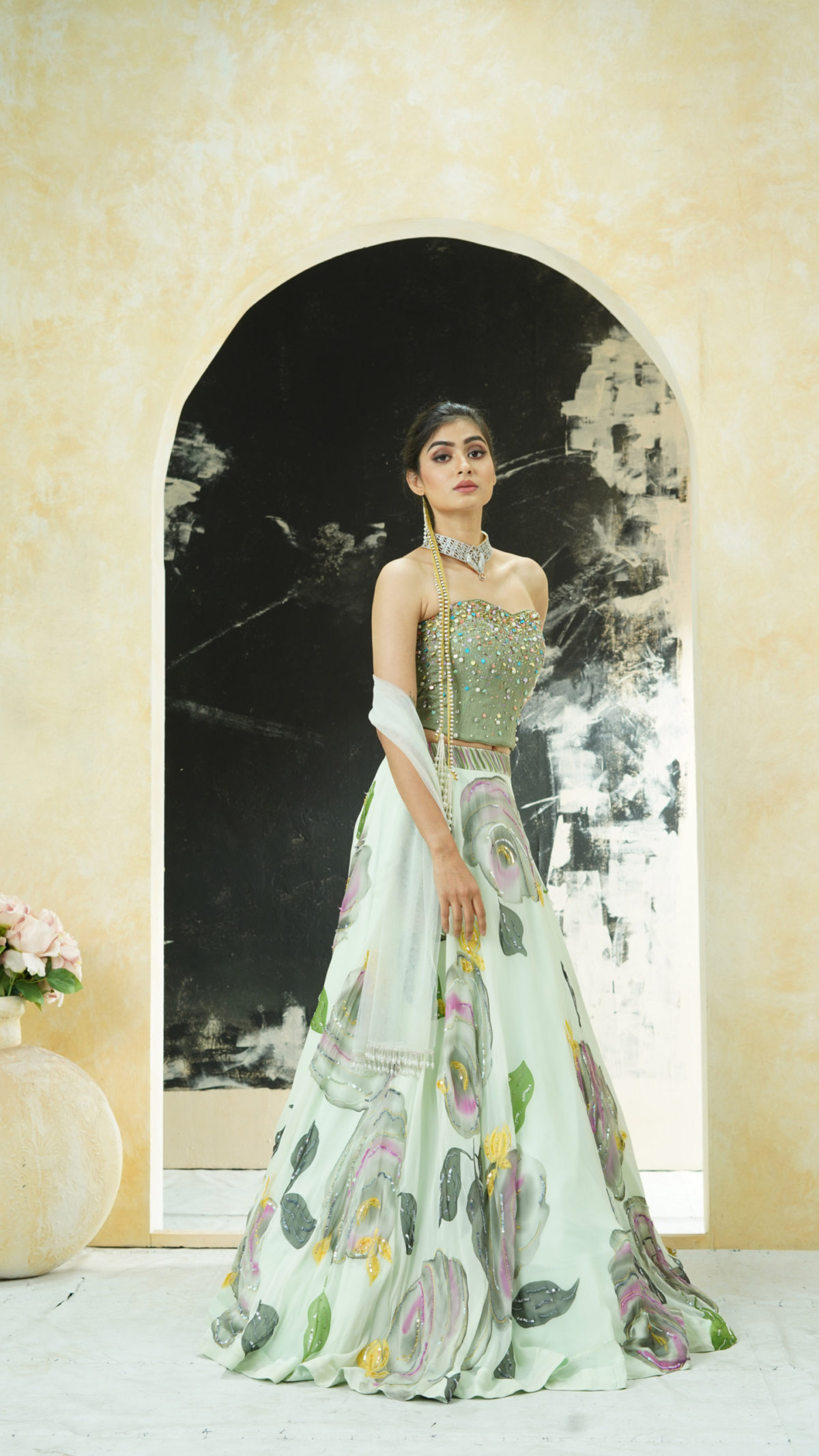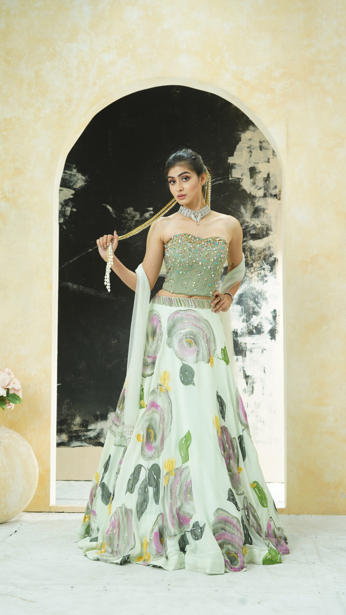 - Mint Green georgette hand painted and hand embroidered lehenga with Sage Green embroidered corset and dupatta set.