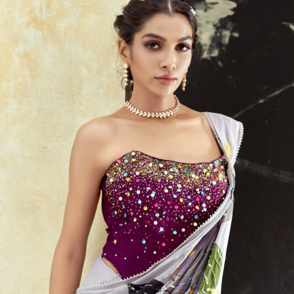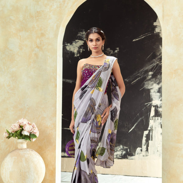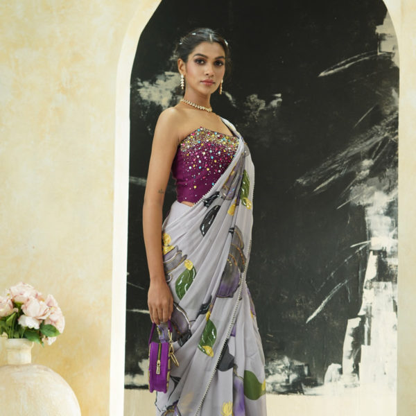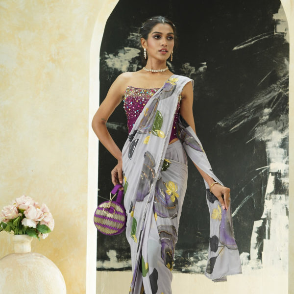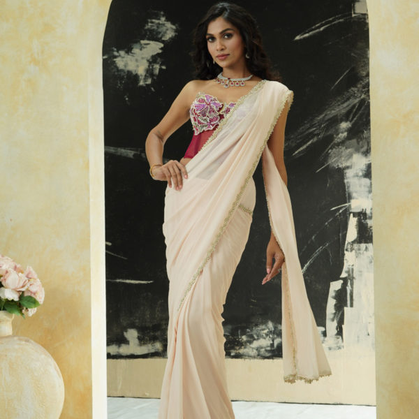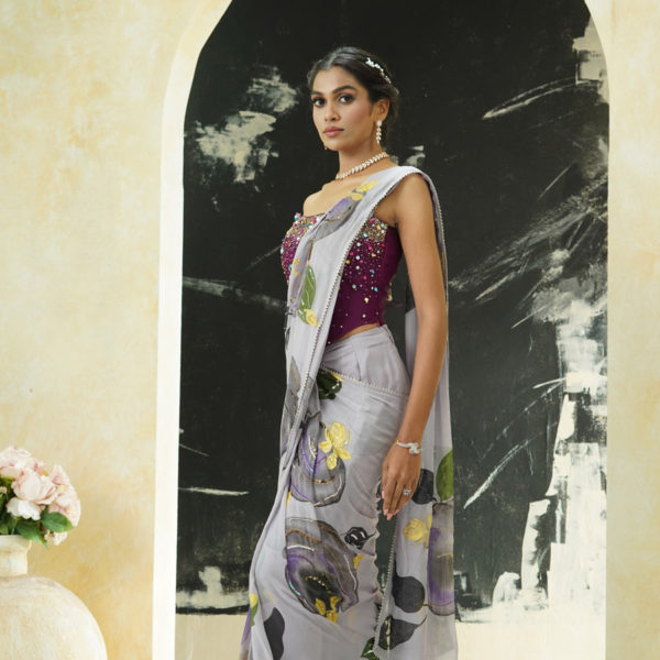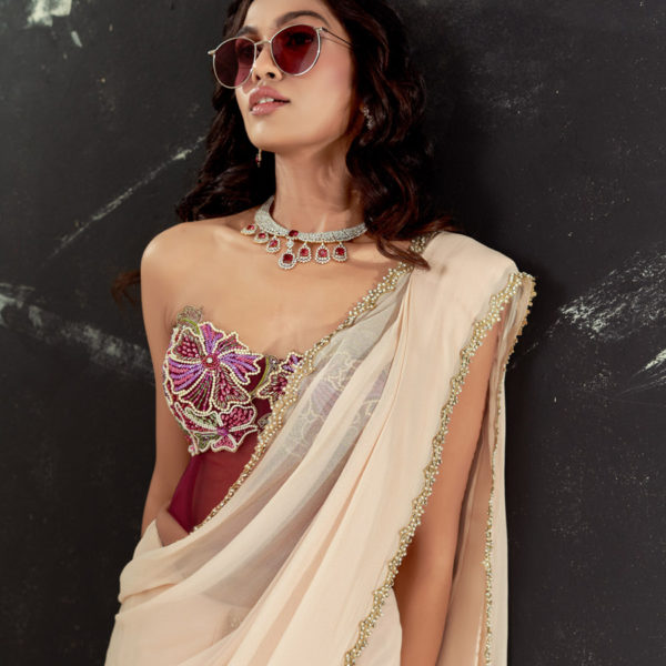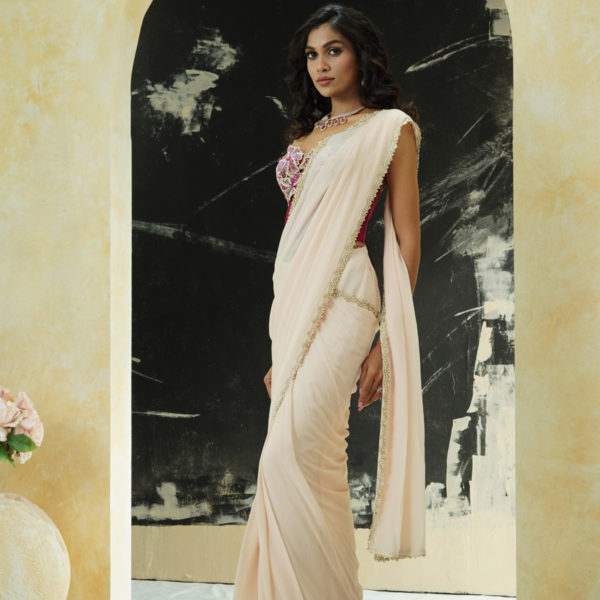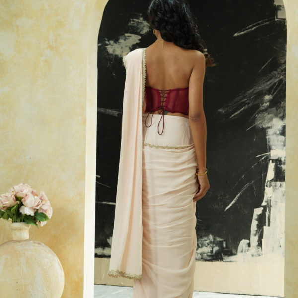- Powder Pink prestiched saree with Burgundy floral embroidered corset.