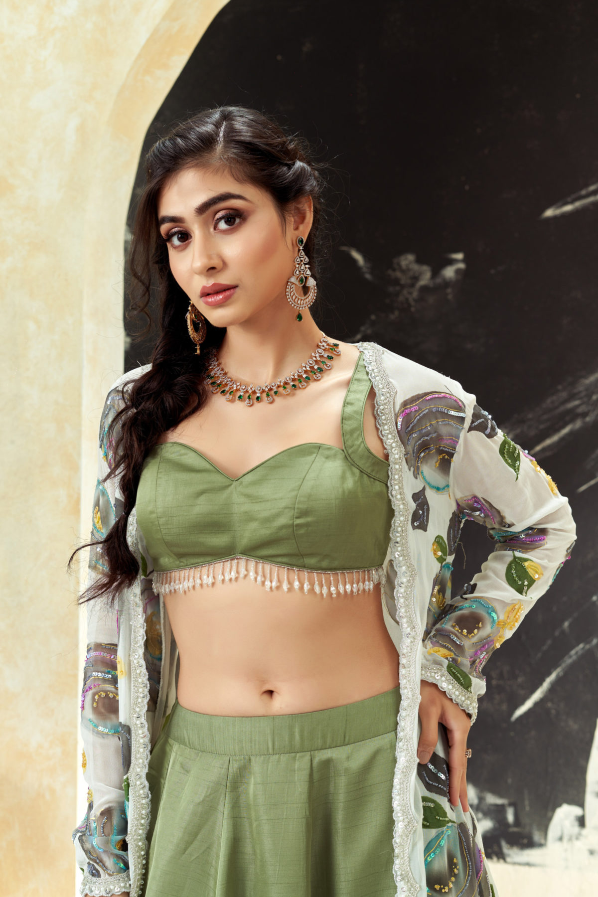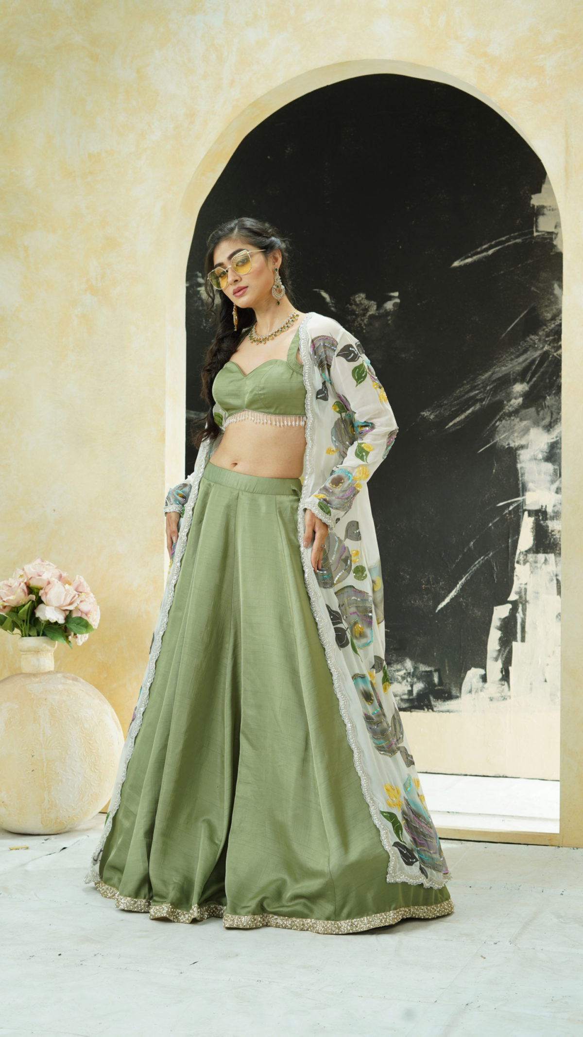 - Sage Green silk lehenga set with tassel detailing paired with Ivory hand painted and hand embroidered long jacket.