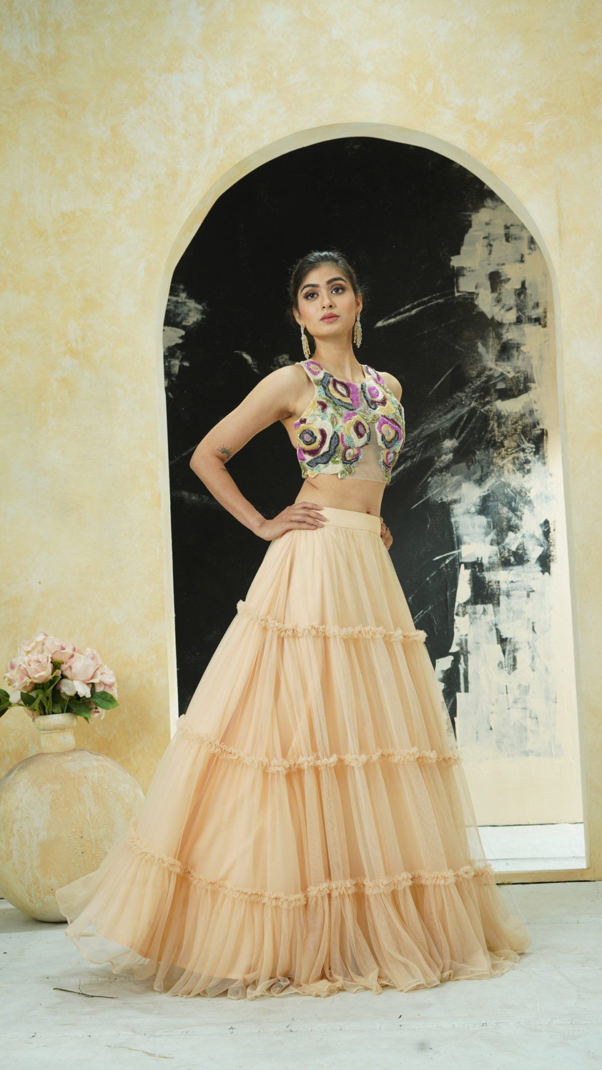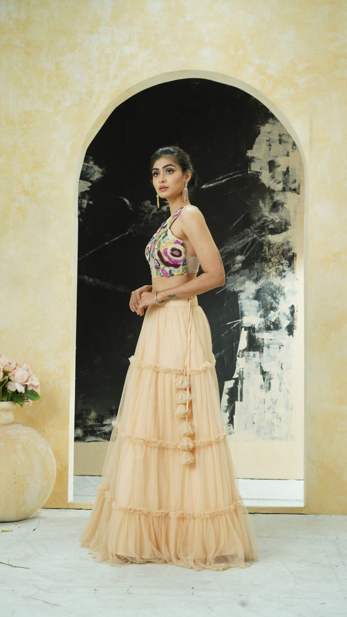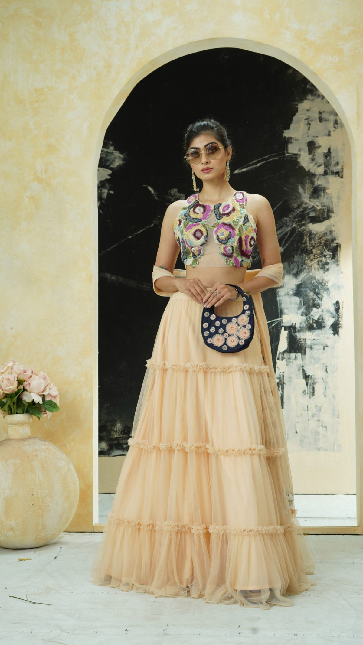 - Multicolour hand embroidered blouse with Beige tier and ruffle skirt and dupatta.