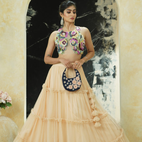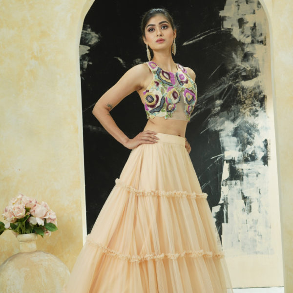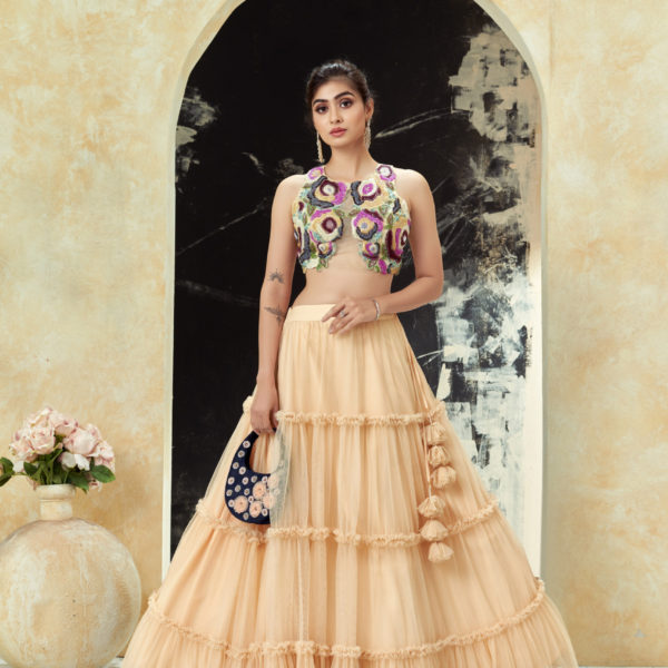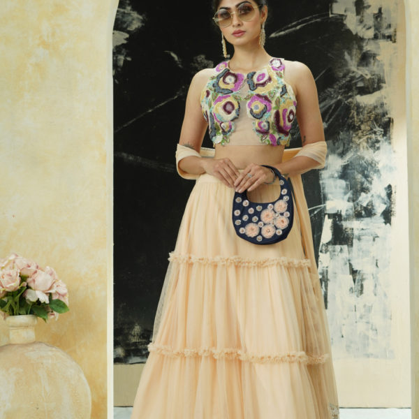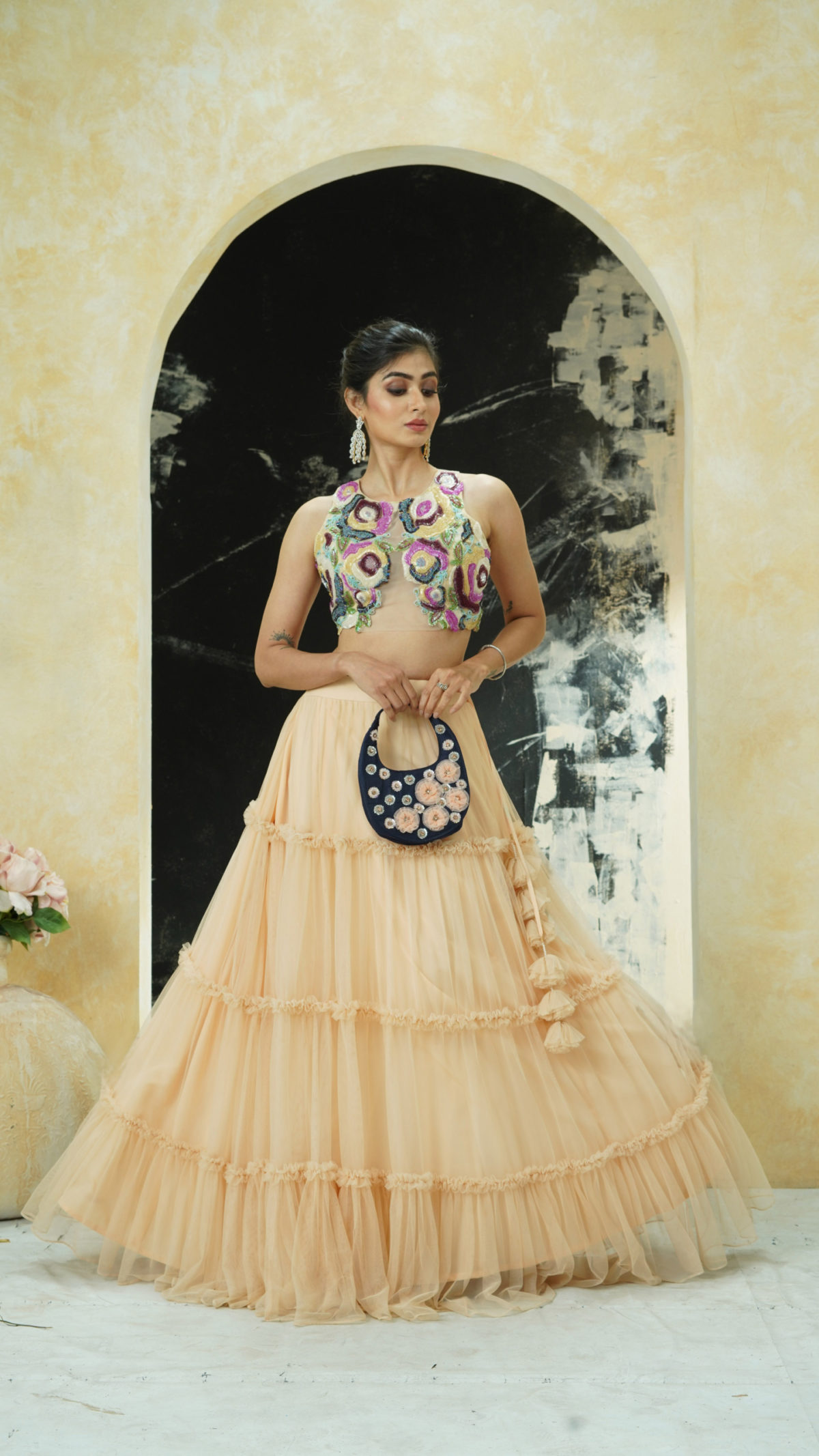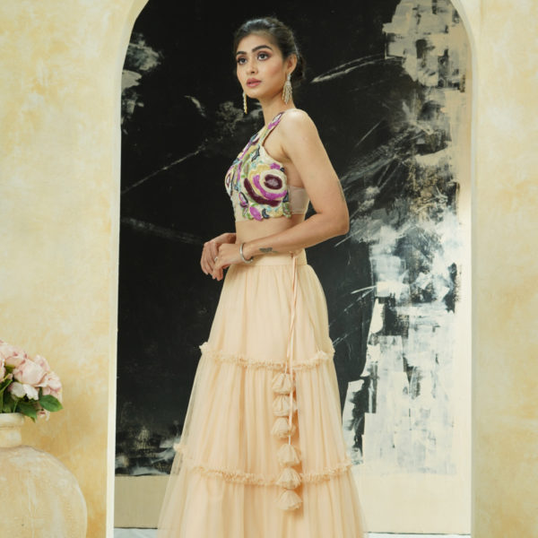 - Multicolour hand embroidered blouse with Beige tier and ruffle skirt and dupatta.