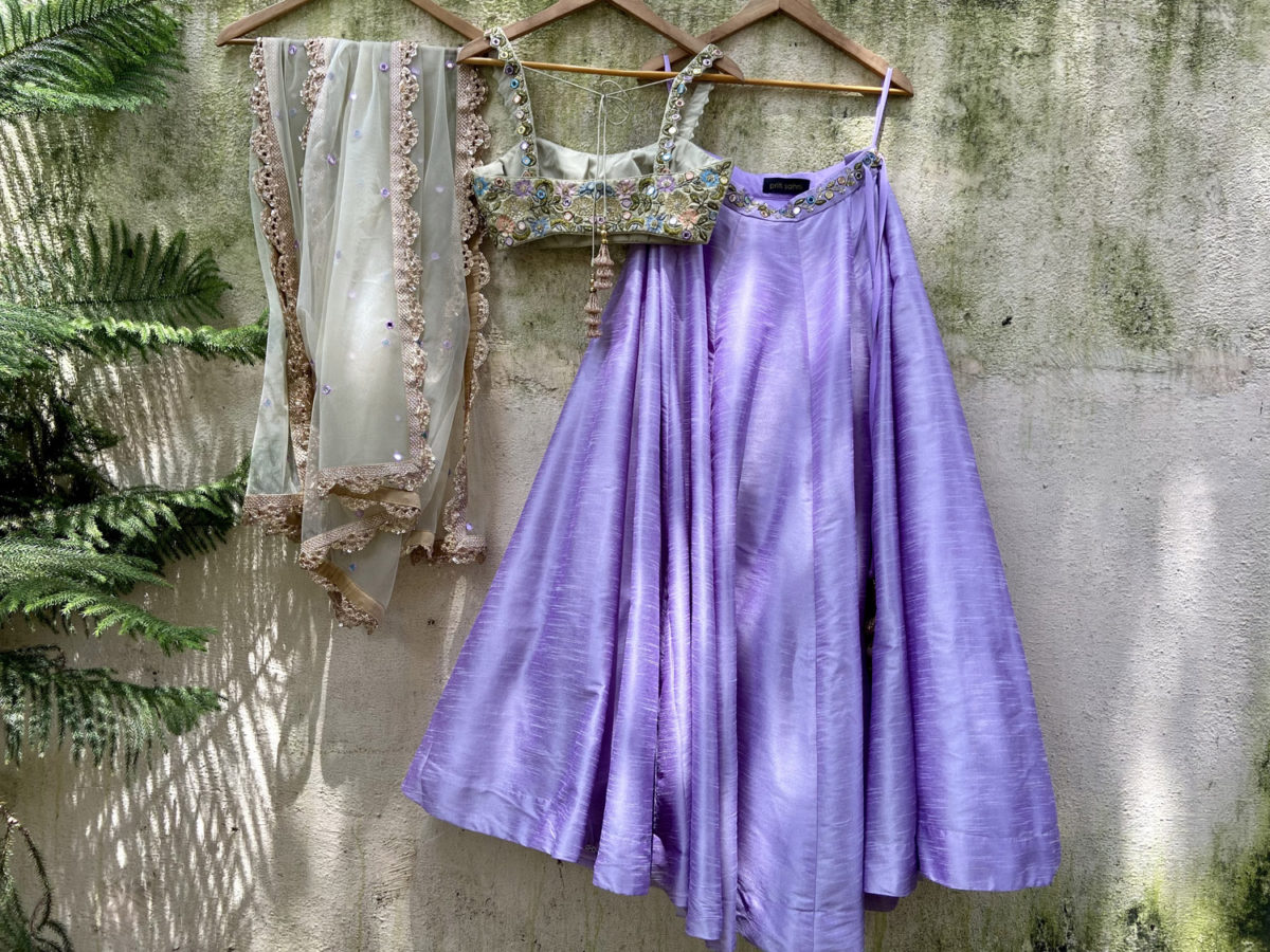 - Tea Green raw silk bustier embellished with multi-hued thread, beads, sequins and mirror, paired with lavender raw silk lehenga and Tea Green tulle dupatta with mirror and thread work highlight.