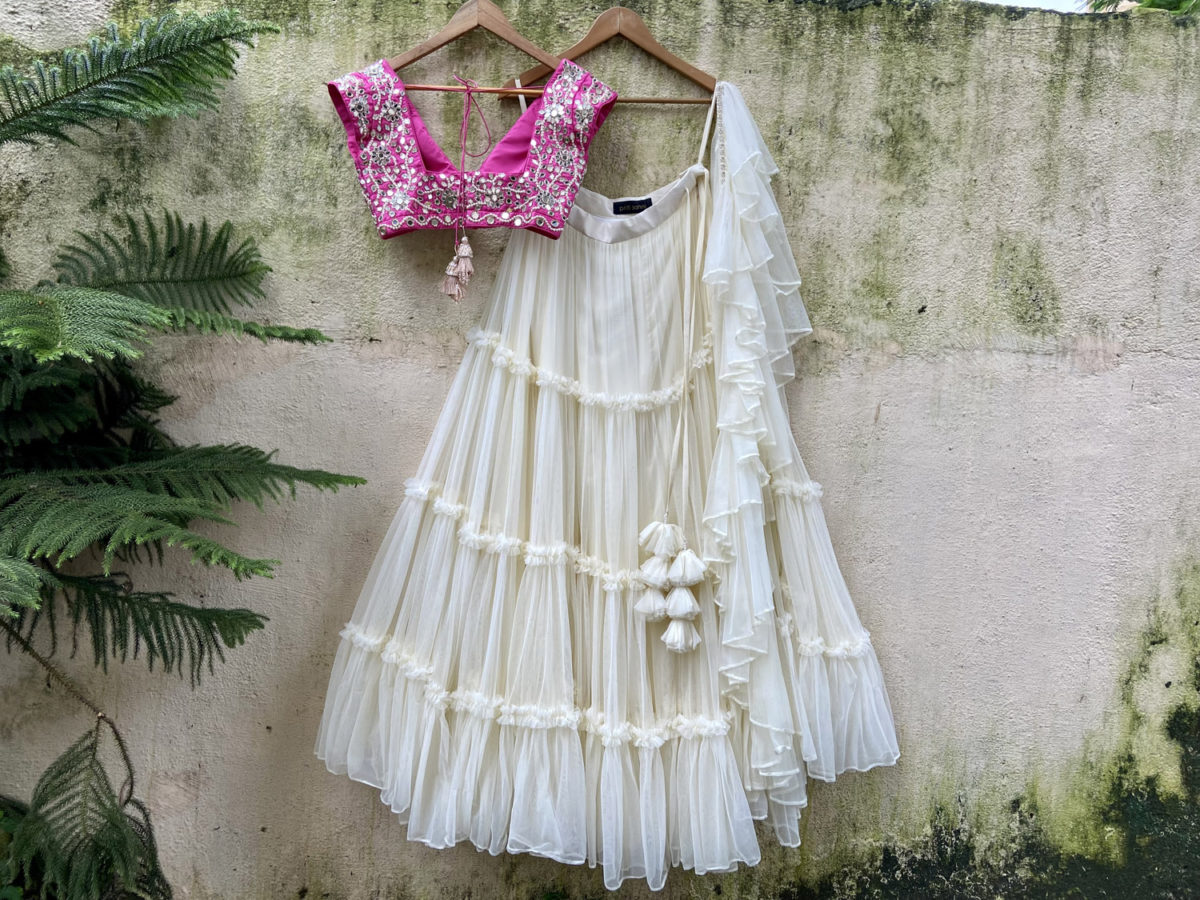 Ivory and Fuchsia Tier and Ruffle Lehenga Set