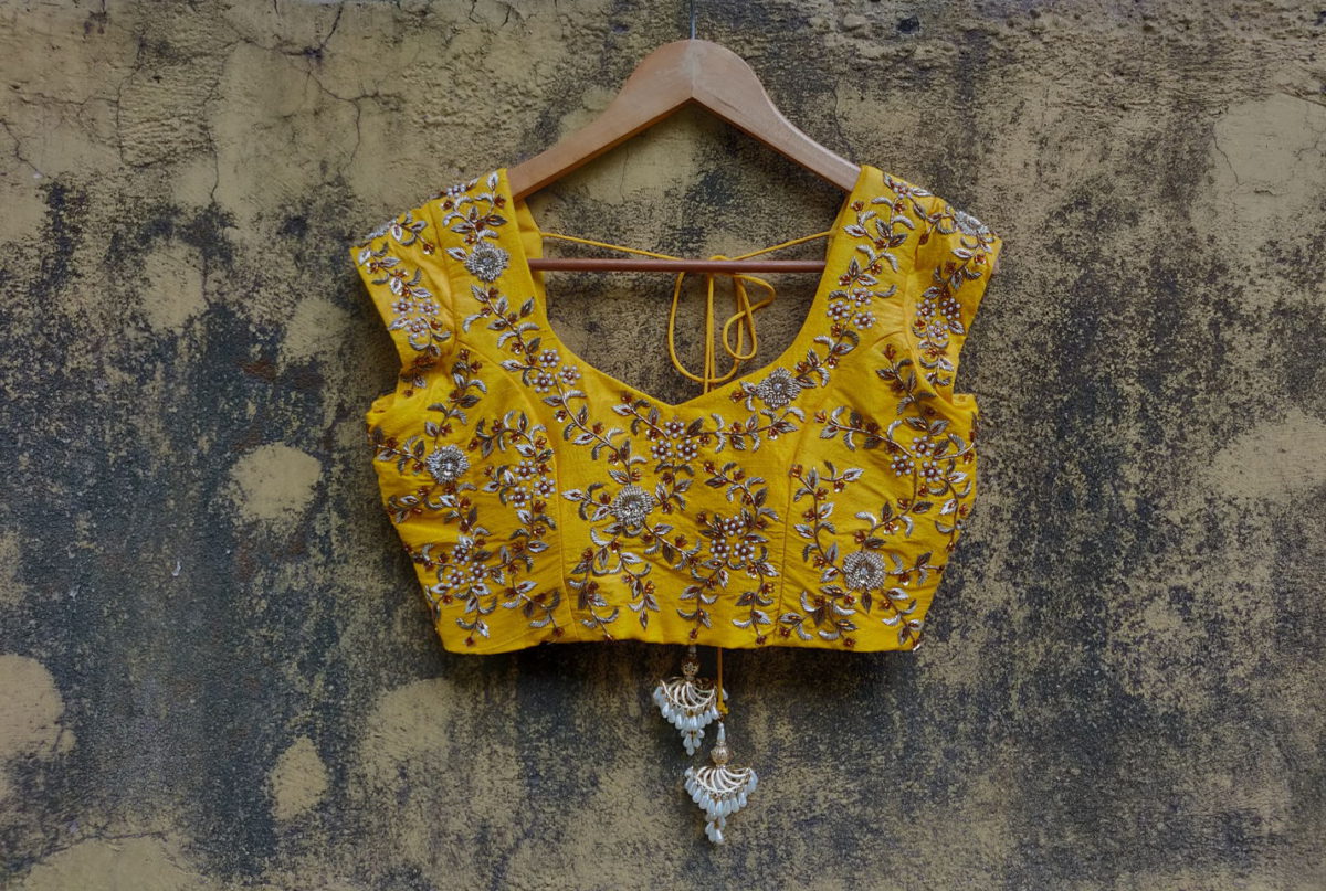 - Our signature Sassy Mirror, pearl and zardozi hand embroidered blouse in contemporary tie up back styling with mirror tassels and short sheer sleeves in mirror highlight. For your comfort, the blouse is padded and is fully finished from inside with soft lining.