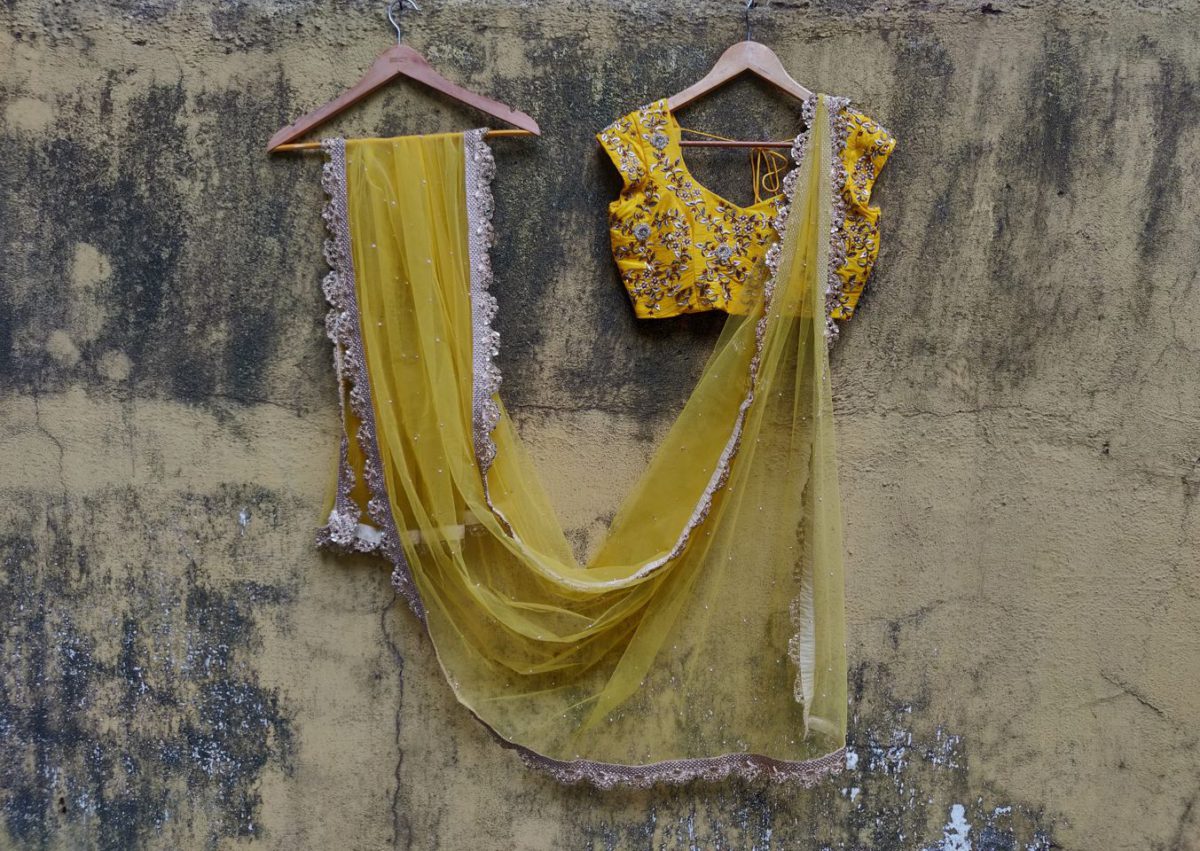 - Meet this graceful Ivory ruffle lehenga and yellow embroidered blouse in classic yet contemporary style, is a perfect pick for brides and bridesmaid. Light weight and fuss-free ivory georgette skirt with traditional gold zari butti is complemented with shimmer ruffle border detailing. Brightening the look is the yellow raw silk blouse embroidered with intricate zardozi, pearls and beads work and…