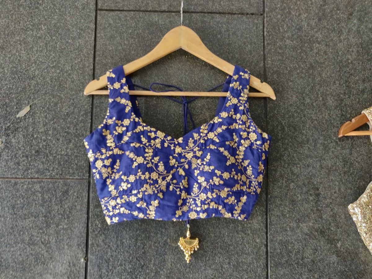 - Sizzle in this graceful Blue ruffle lehenga set, a classic yet contemporary choice for a new-age Indian bridesmaid. Light weight deep blue georgette skirt with traditional gold zari butti design allover matched well with smart shimmer ruffle border detailing and sequin-pearl work is your best bet to set the dance floor on fire. Subtly embroidered zari and sequin work cropped…