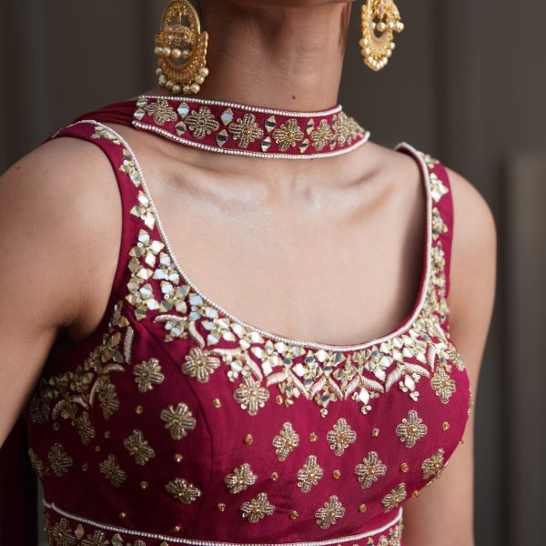 Price range: £410.00 through £480.00Price range: £205.00 through £240.00 - Maroon hand embroidered chiffon peplum kurta with chiffon sharara pants and georgette choker dupatta.