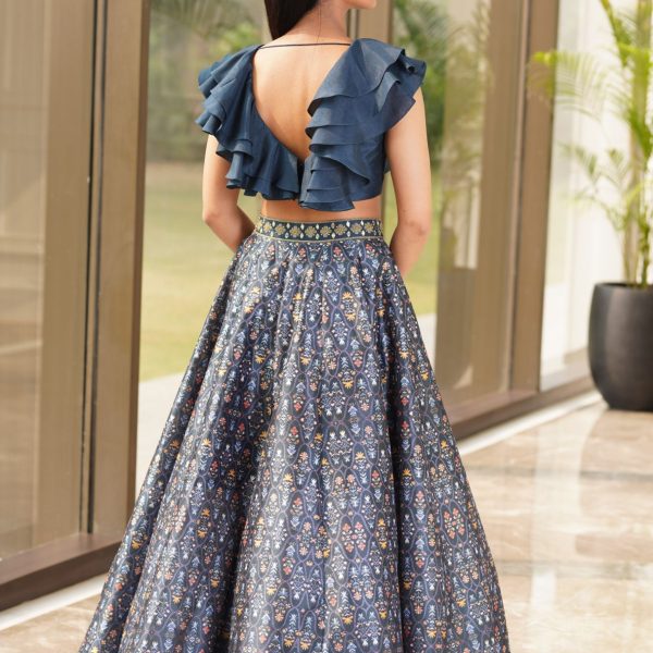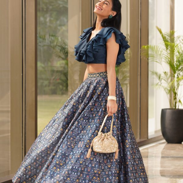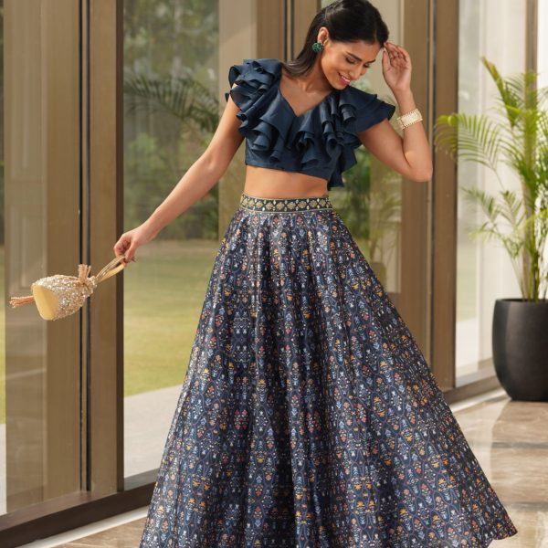 Price range: £366.00 through £470.00Price range: £183.00 through £235.00 - Navy Blue Silk Dupion Printed Lehenga with Embroidered Belt paired with One Shoulder Cotton Silk Ruffle Blouse.