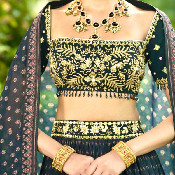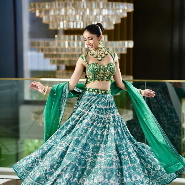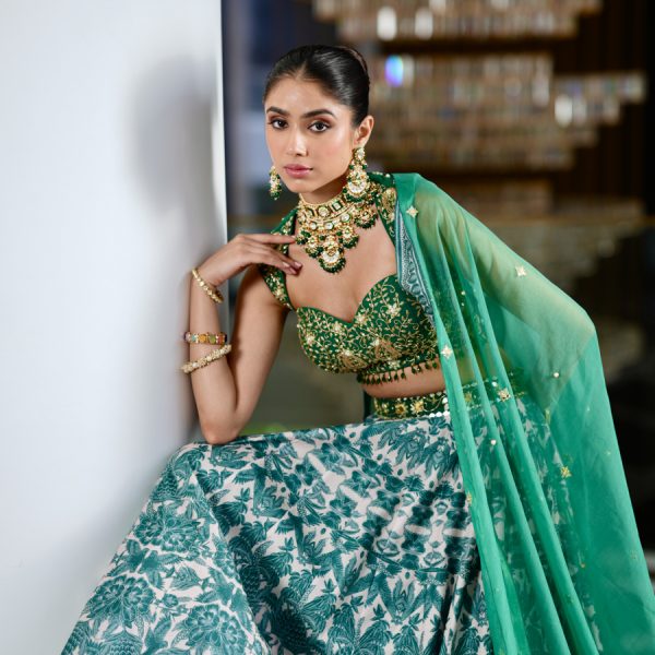 Price range: £402.00 through £490.00Price range: £201.00 through £245.00 - Teal Green Hand Embroidered Ruffled Blouse paired with Printed Lehenga Set.