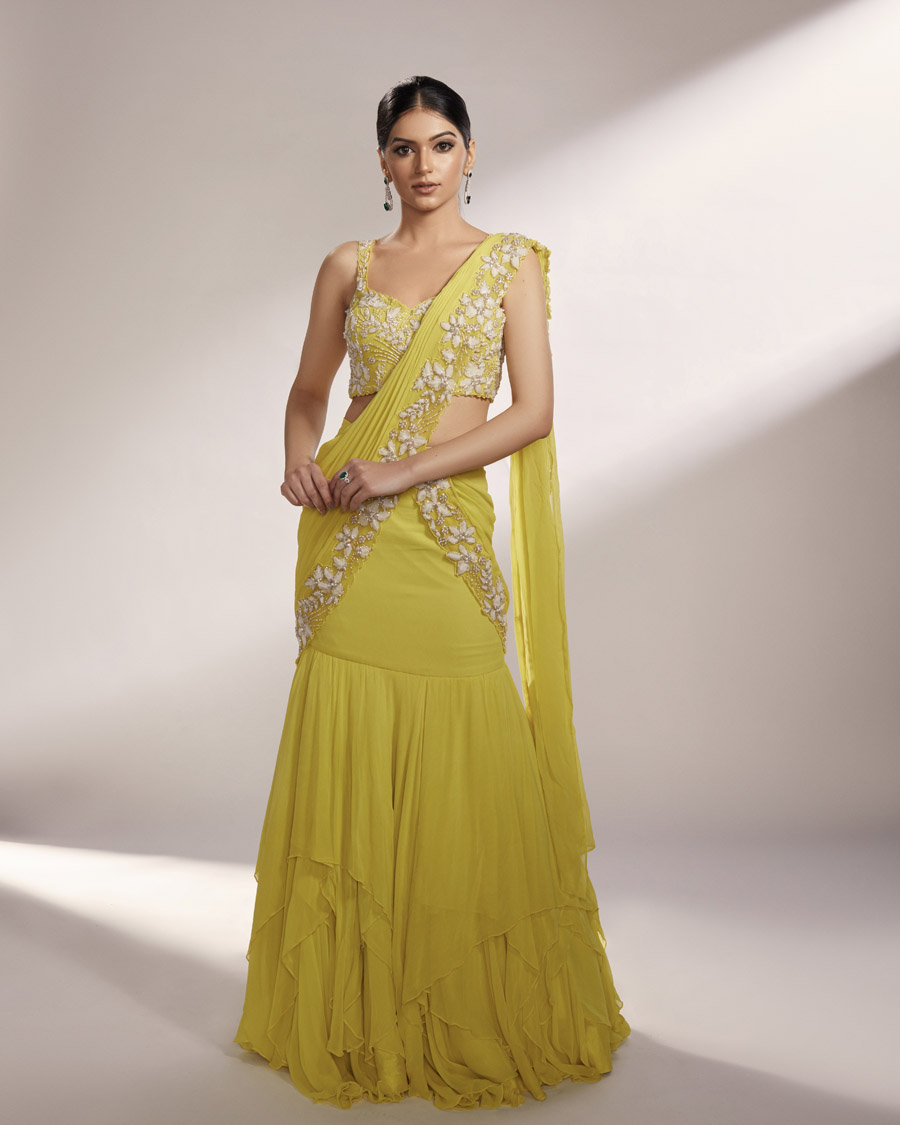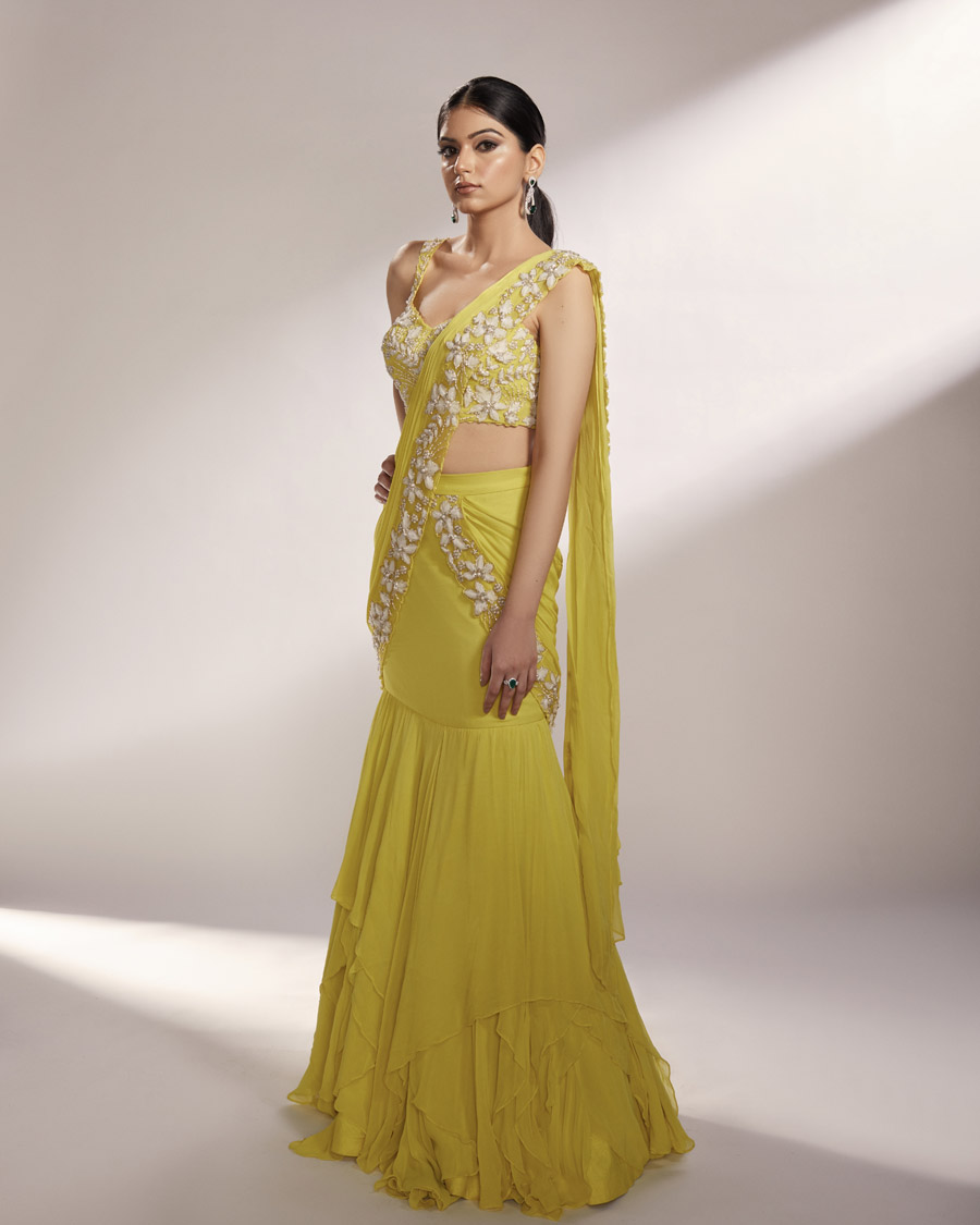 - Featuring an ombre shaded blouse with cap sleeves in sea green paired with flowy satin layered drape saree. Perfect for sangeet, cocktail, or haldi—style with statement jewellery and heels for an elegant finish.