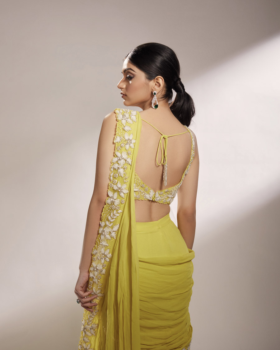 Champagnee Hand Embroidered Blouse With Drape Saree