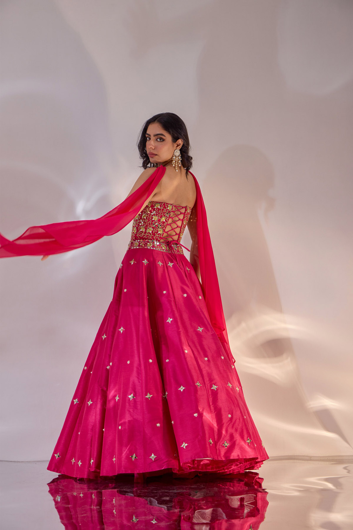 Pink Hand Embroidered Silk Lehenga paired with a Hand Embroidered Georgette Corset and Our Signature Choker Dupatta