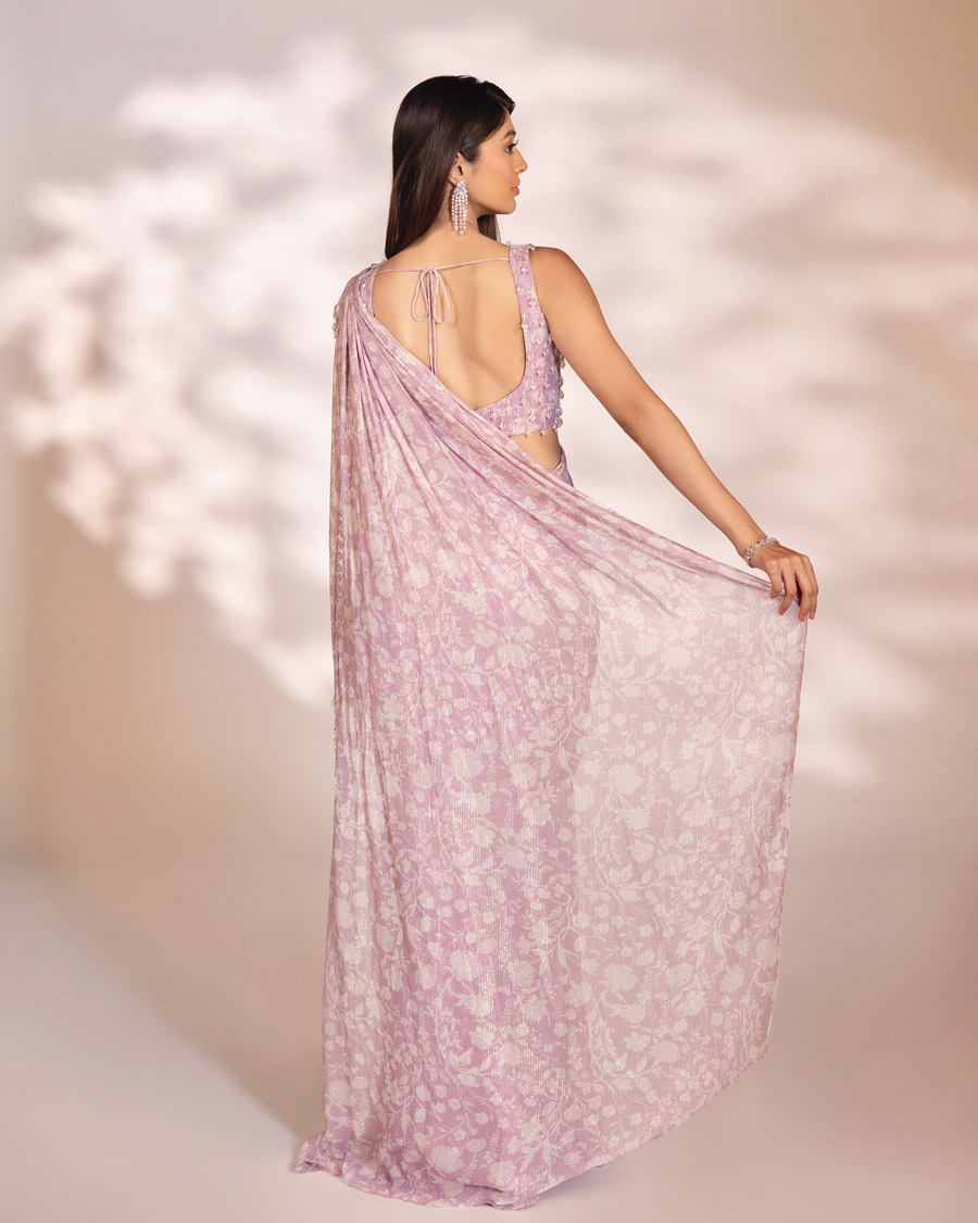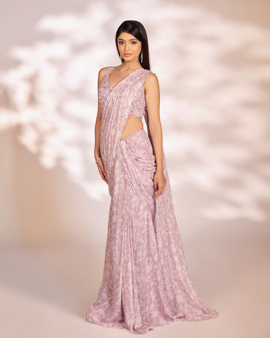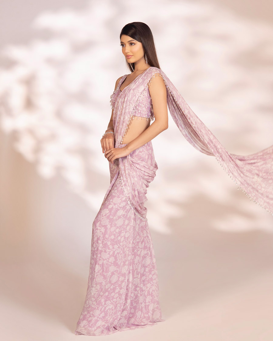 Purple pre-draped saree with glass drop hangings embellished on the blouse and pallu.