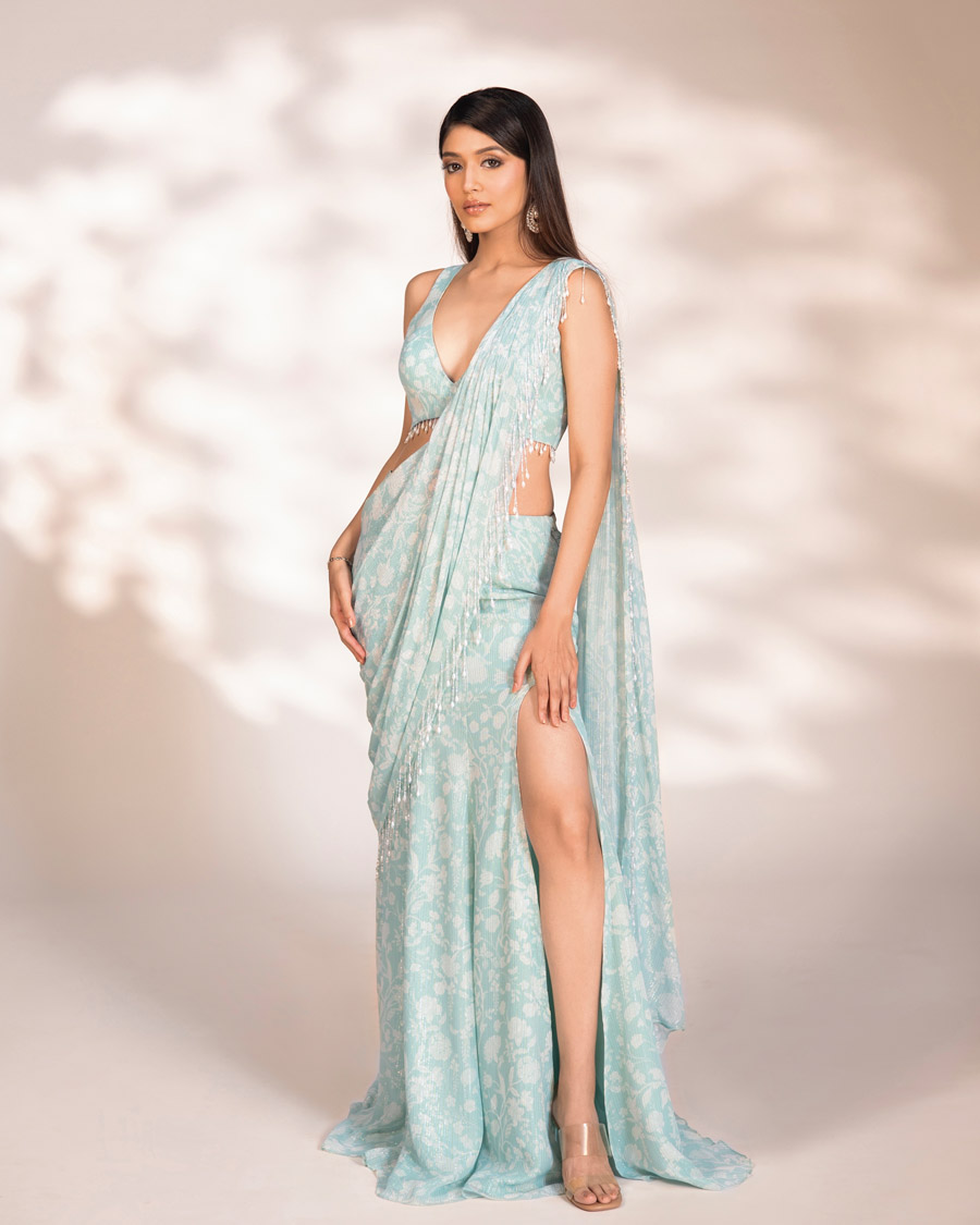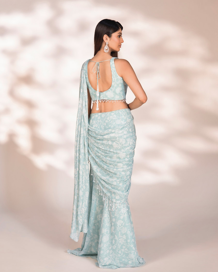 Blue printed pre-draped saree with embroidered tassels on pallu and blouse.