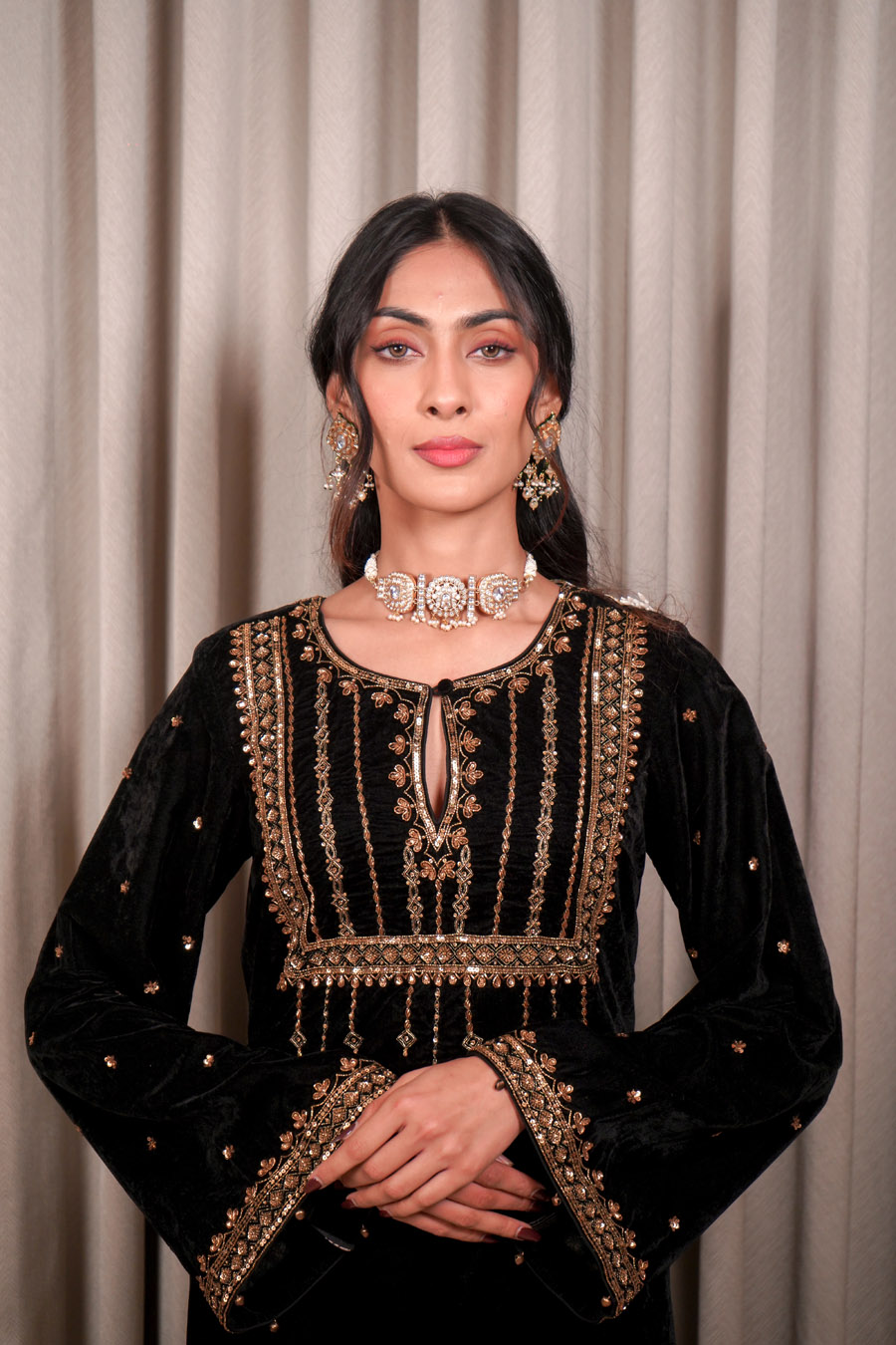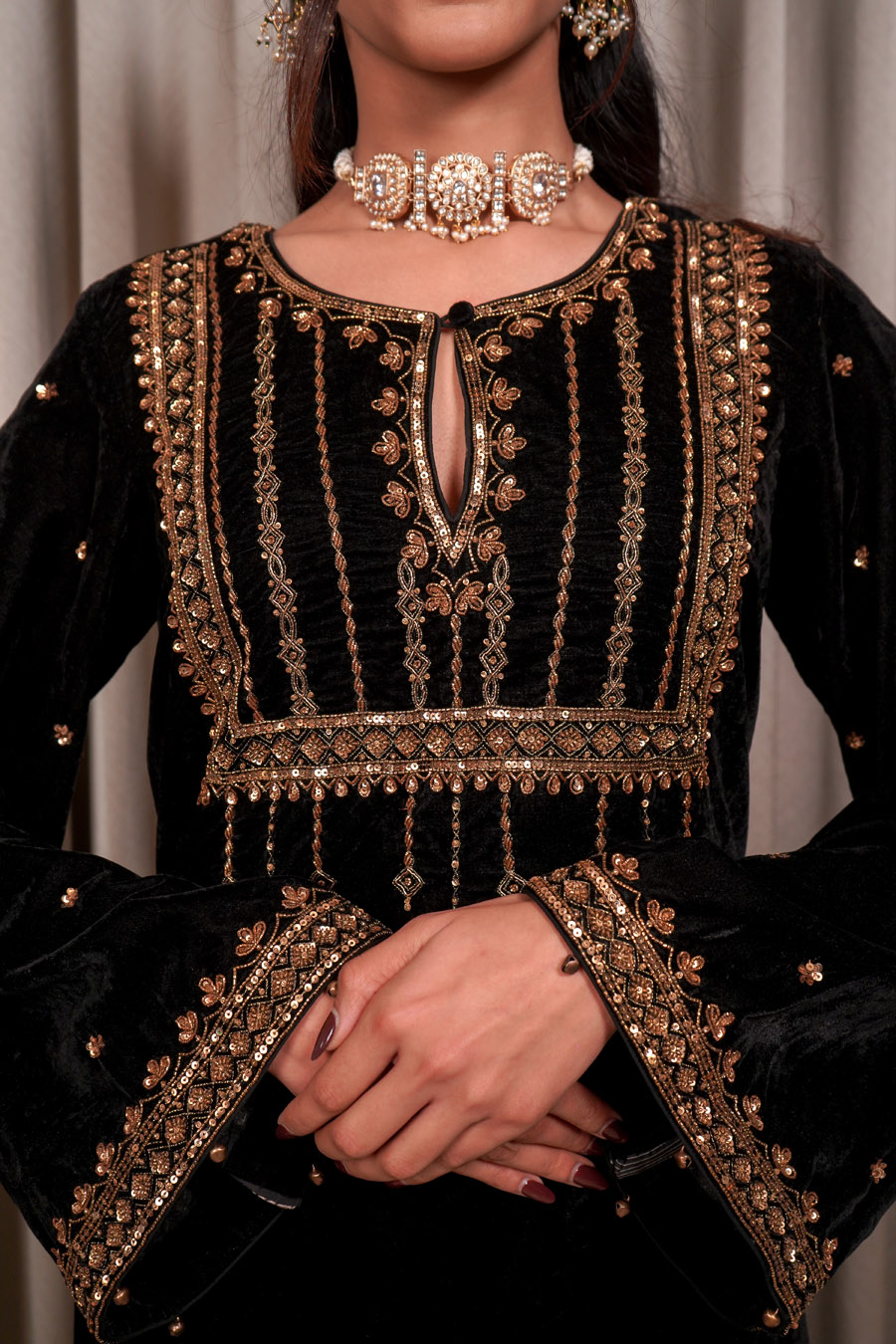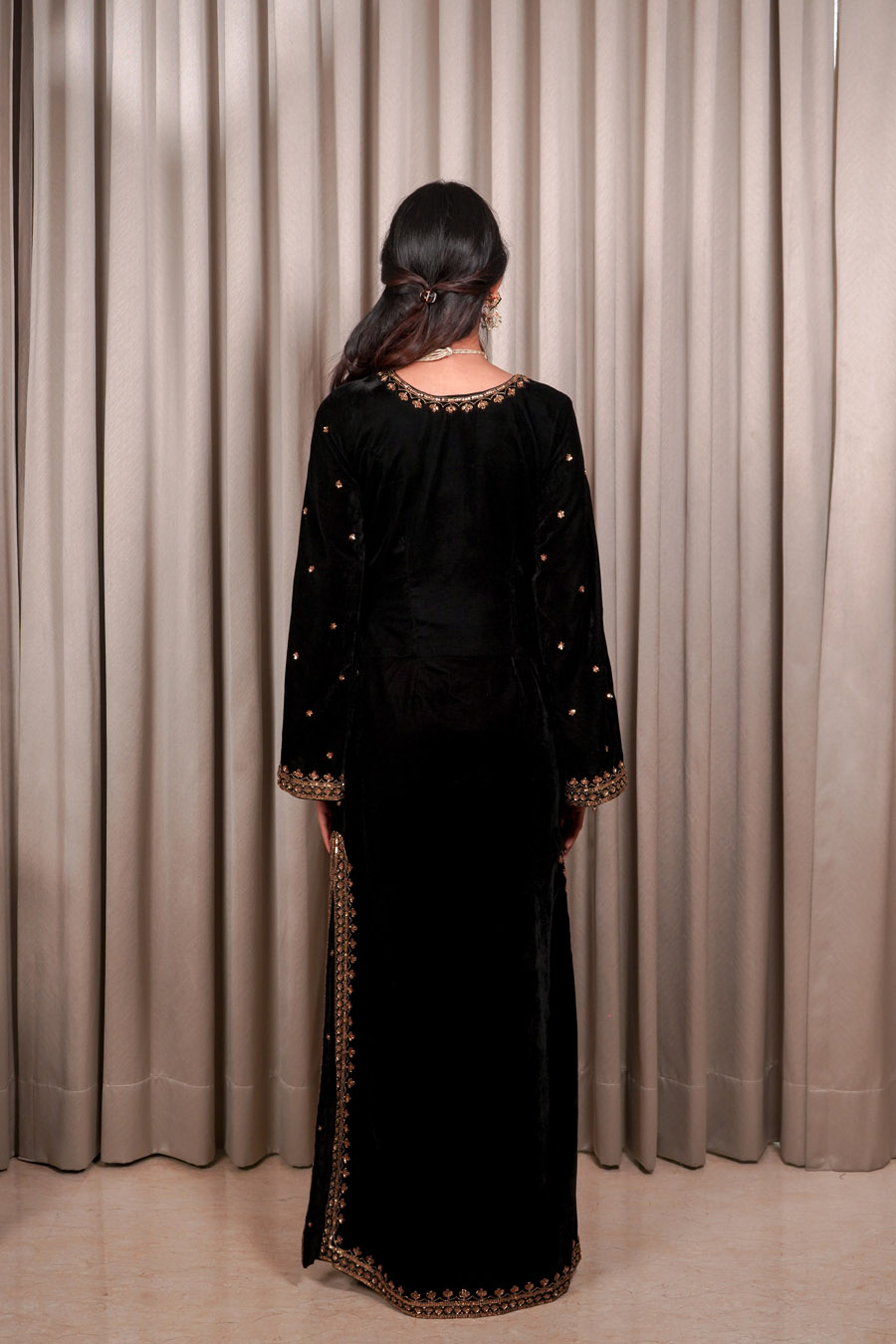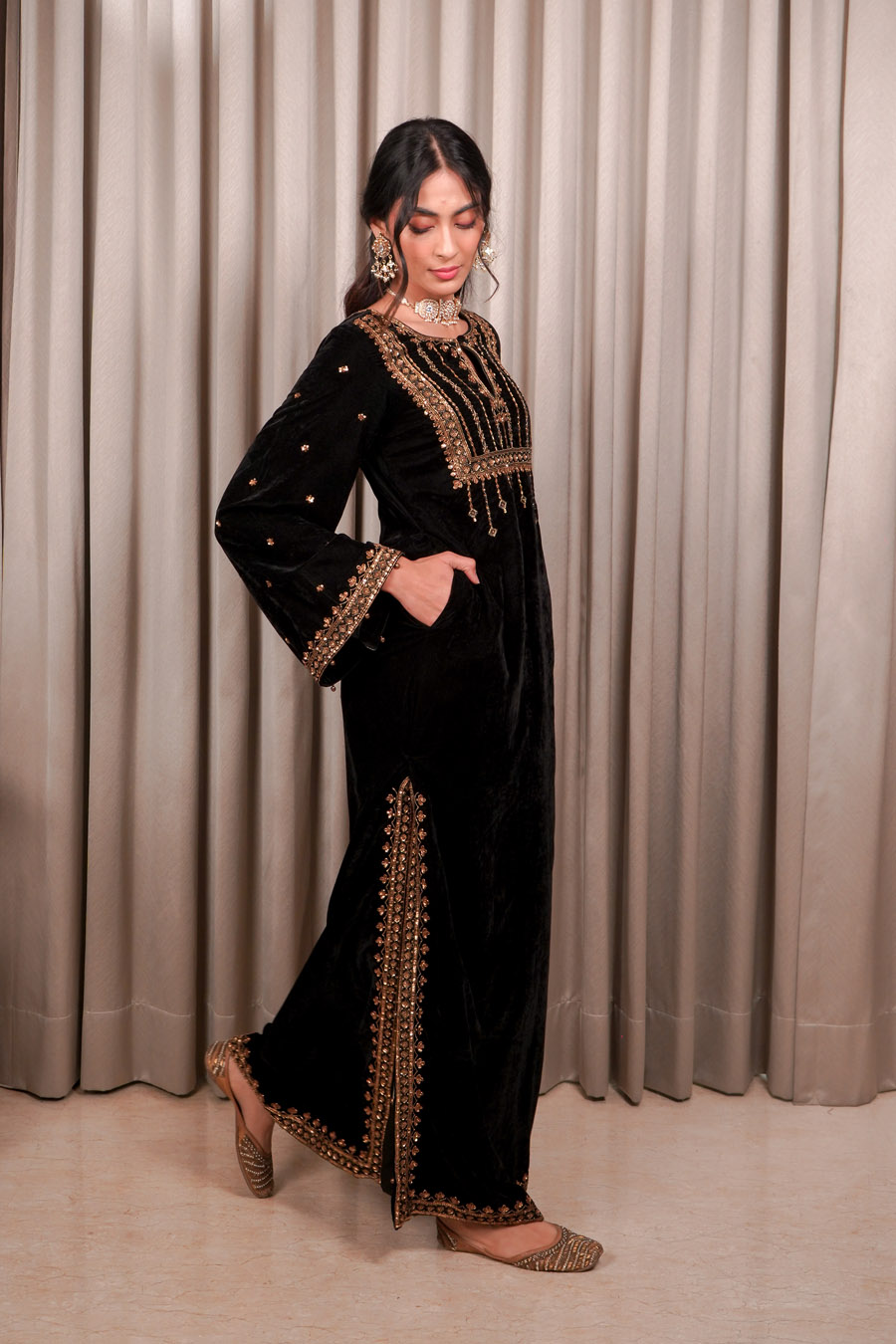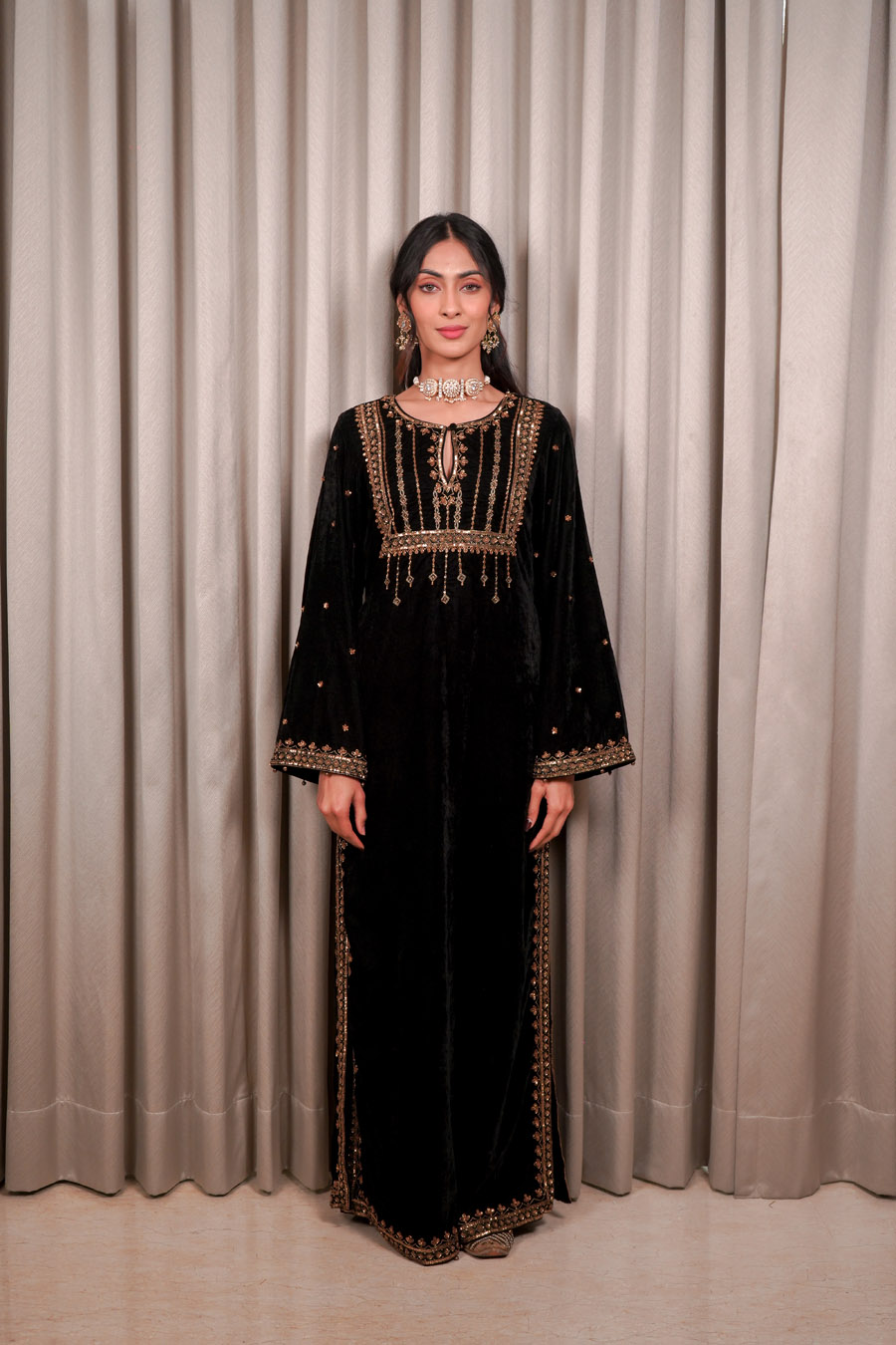 It Consists of Velvet base kaftan with embellished neck work, flowing bell sleeves, and intricate handwork along the side slits. Finished with pockets.