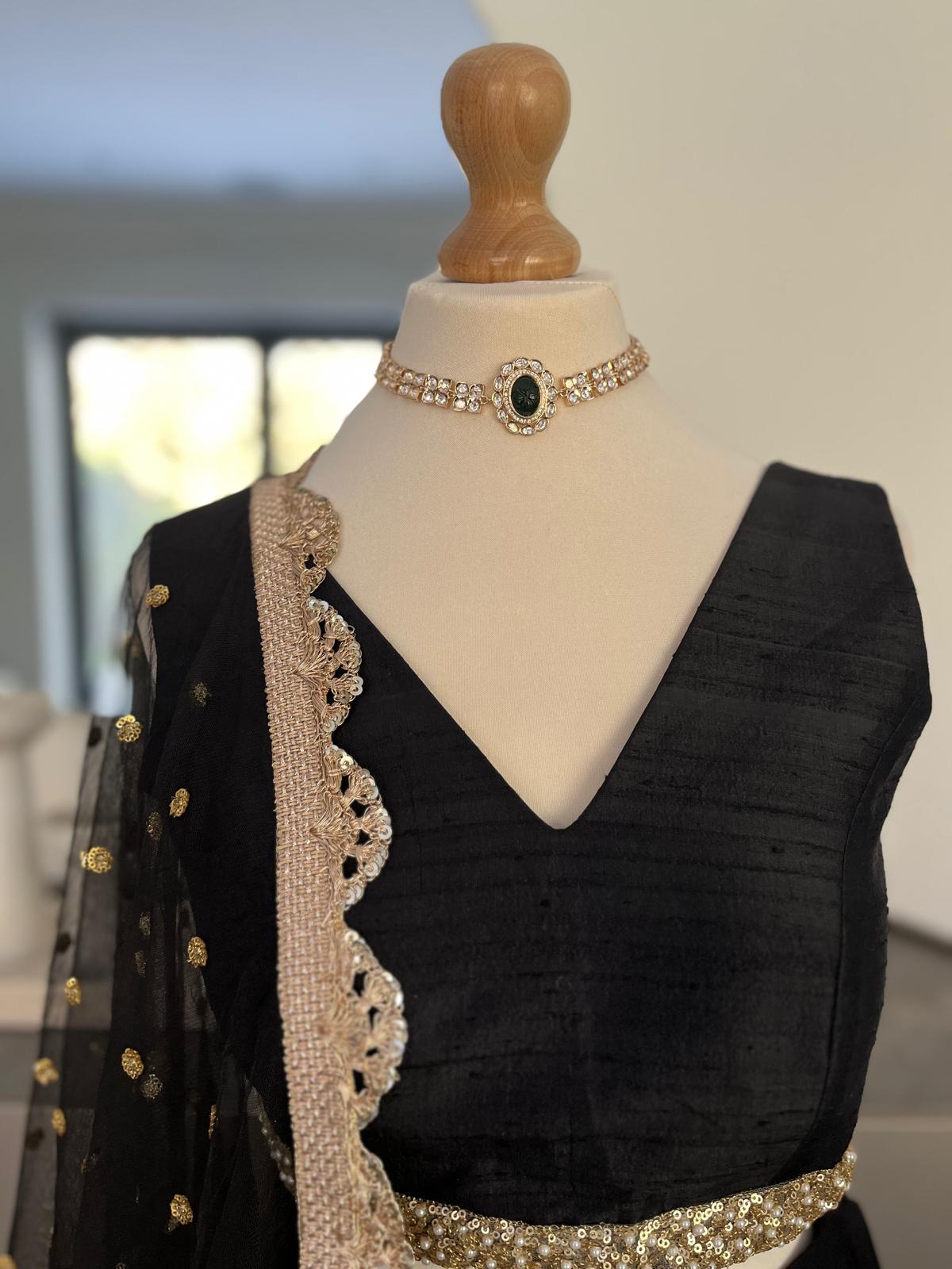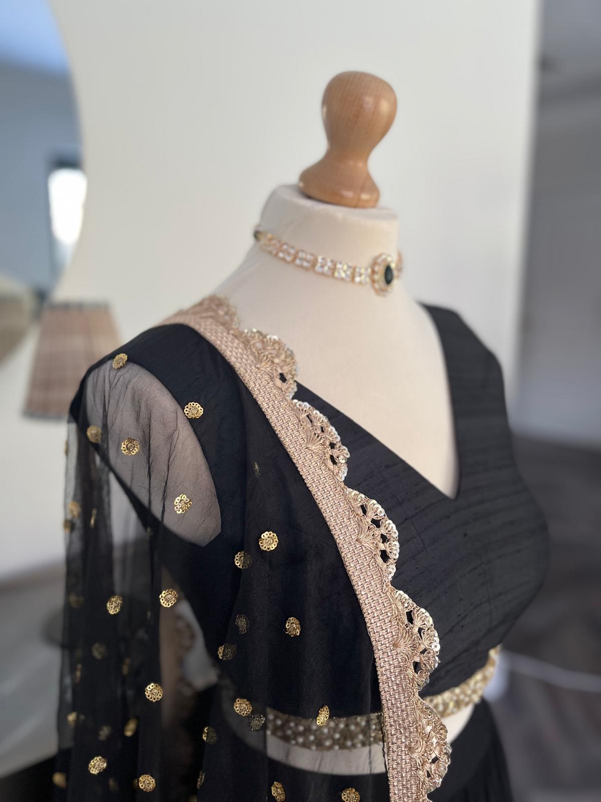 Black tiered tulle with ruffle detailing lehenga teamed with a black raw silk blouse with a modest neckline depth. A net dupatta with a gold scalloped border completes the look.