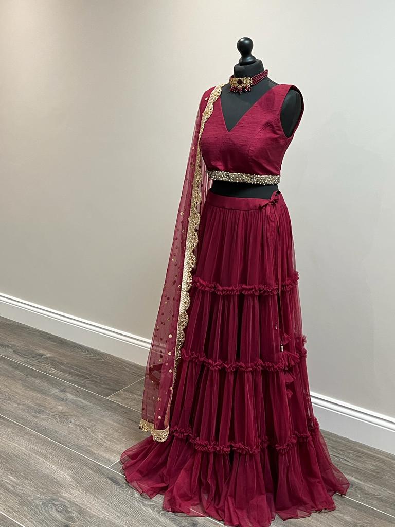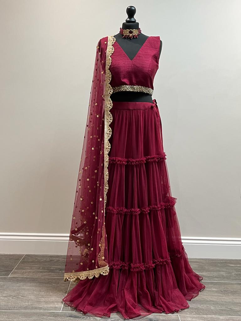 Burgundy Tiered Tulle With Ruffle Detailing Lehenga