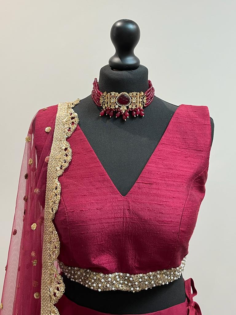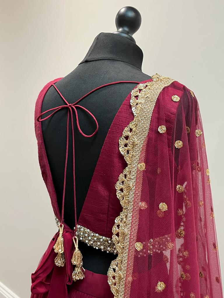 Our bespoke burgundy tiered tulle with ruffle detailing lehenga teamed with a burgundy raw silk blouse with a modest neckline depth. A net dupatta with scalloped gold border completes the look.