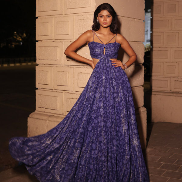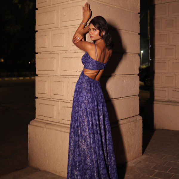 Featuring cutwork halter neck drape gown with tie-back detail at the back