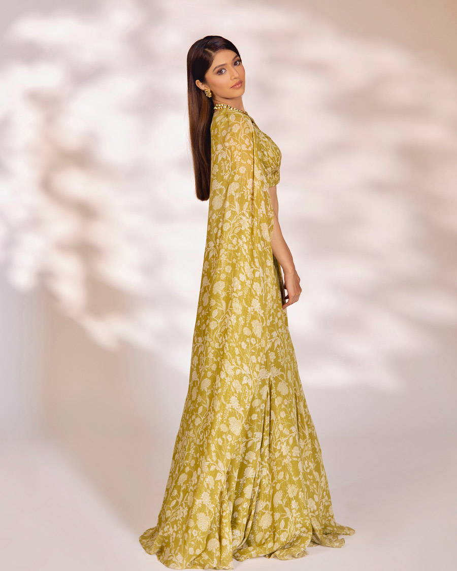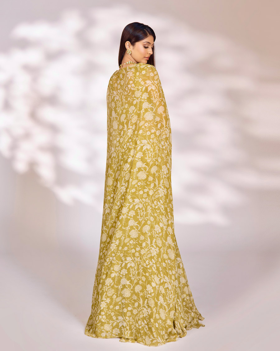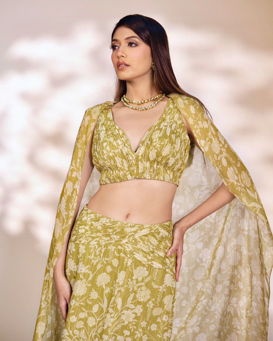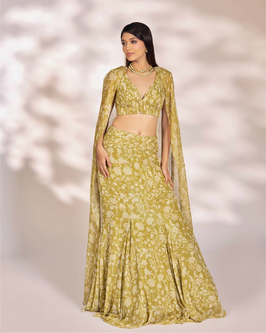 Green cape-lehenga set with ruching details on blouse and skirt.