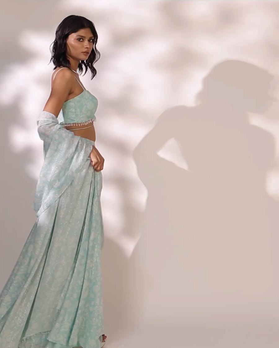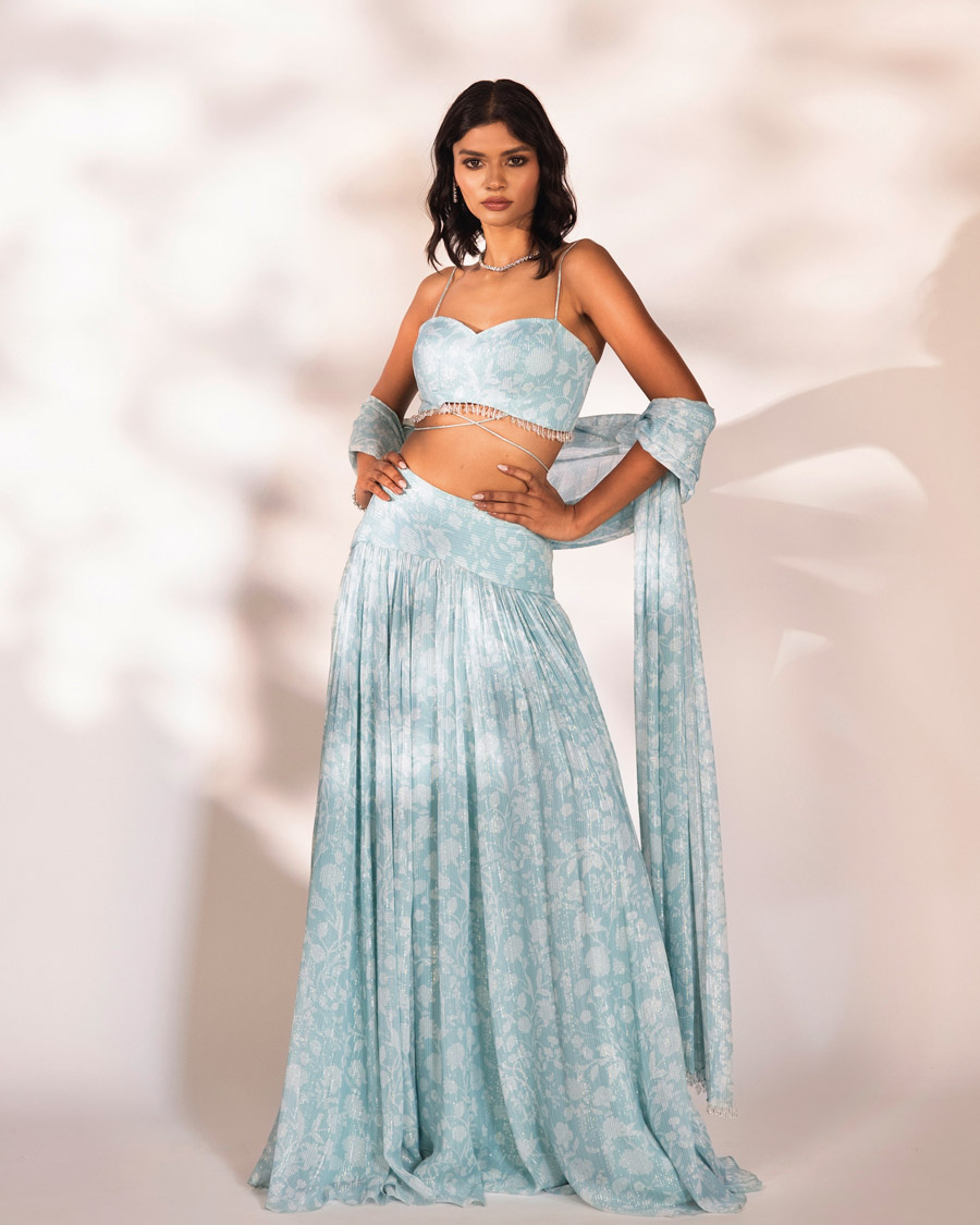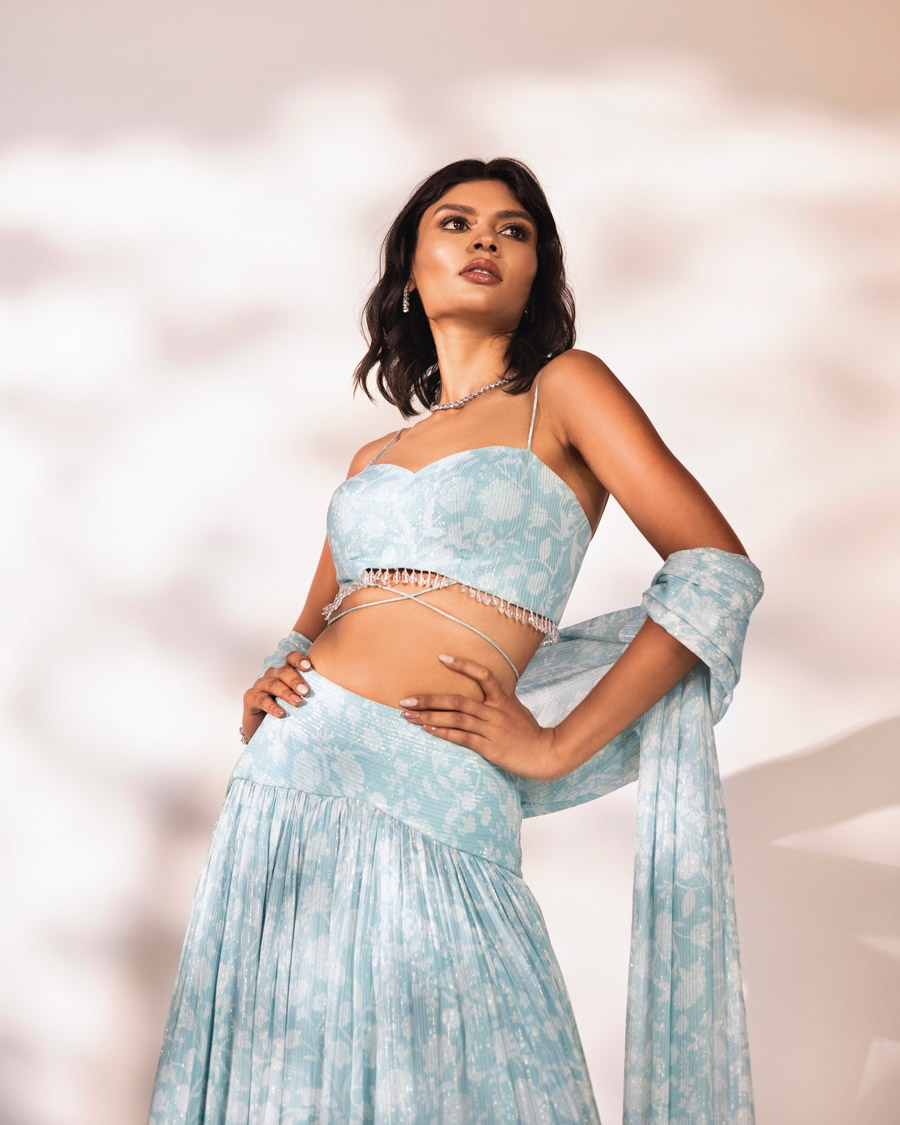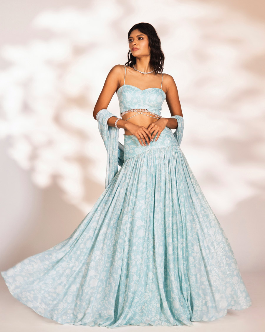 Blue lehenga set with glass drops embroidered on blouse and dupatta.