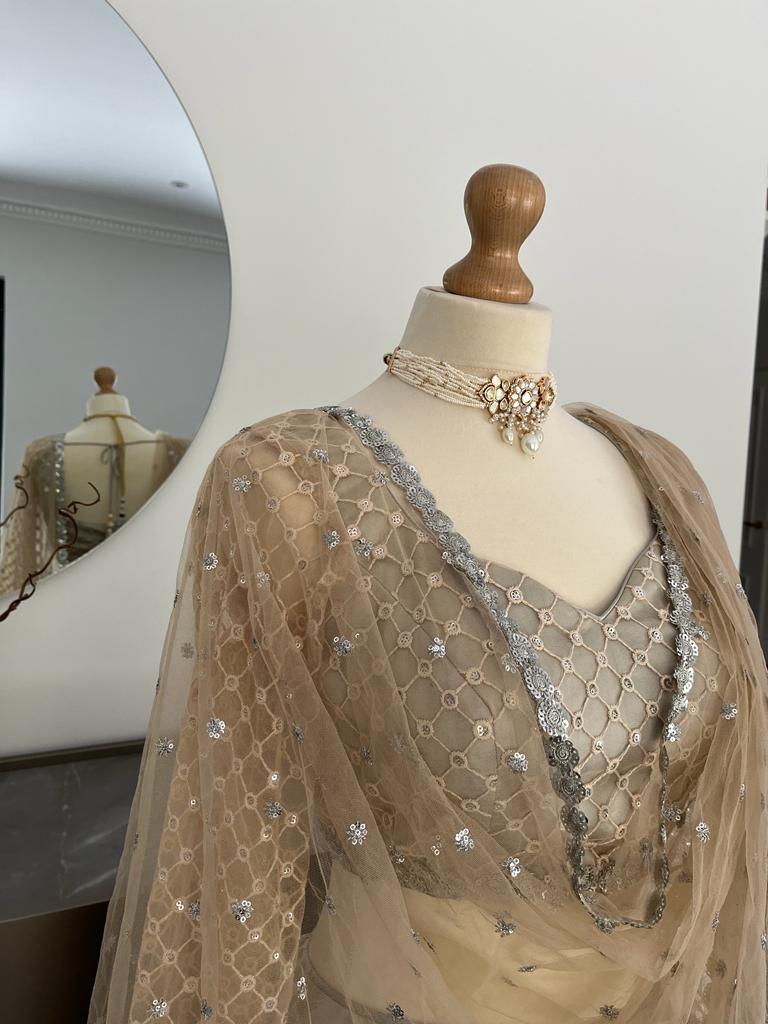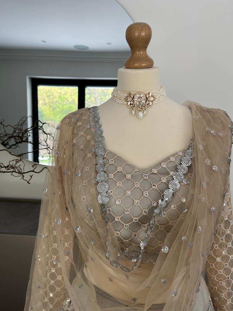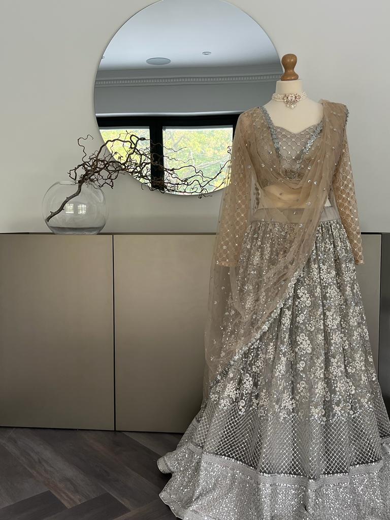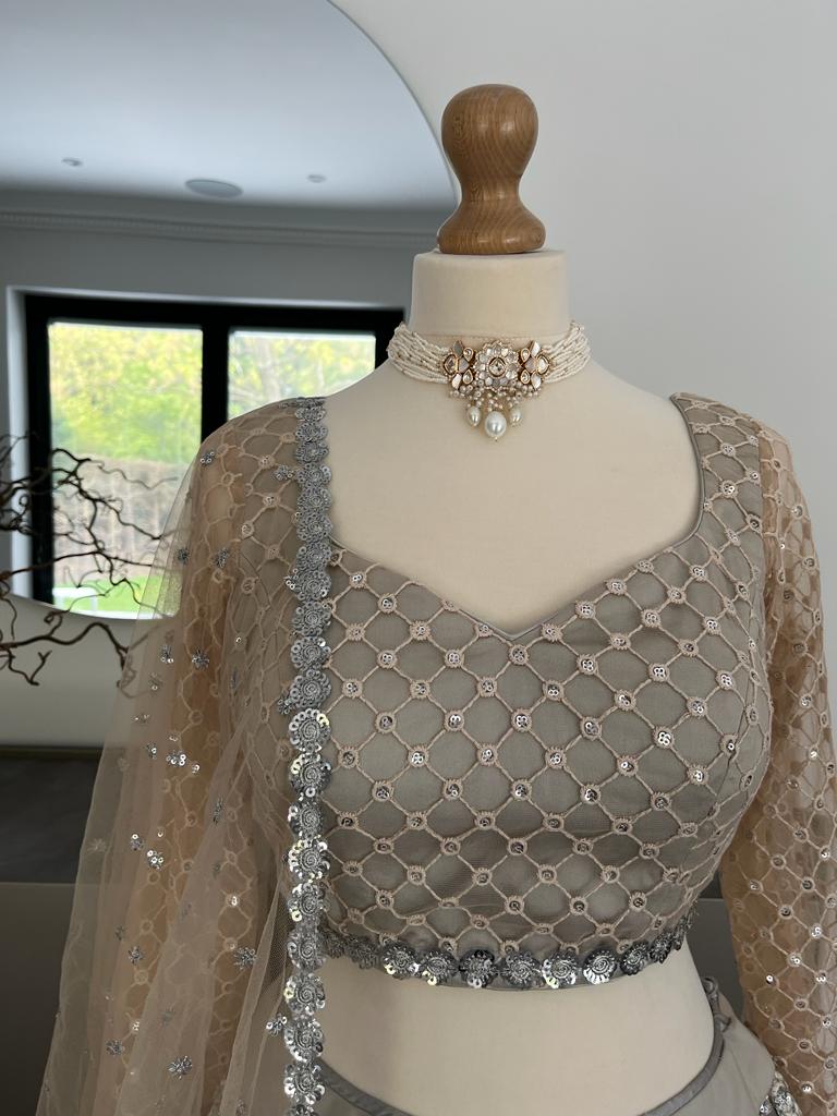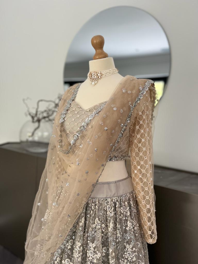 Grey & Beige Shimmer Lehenga with Full Sleeved Blouse